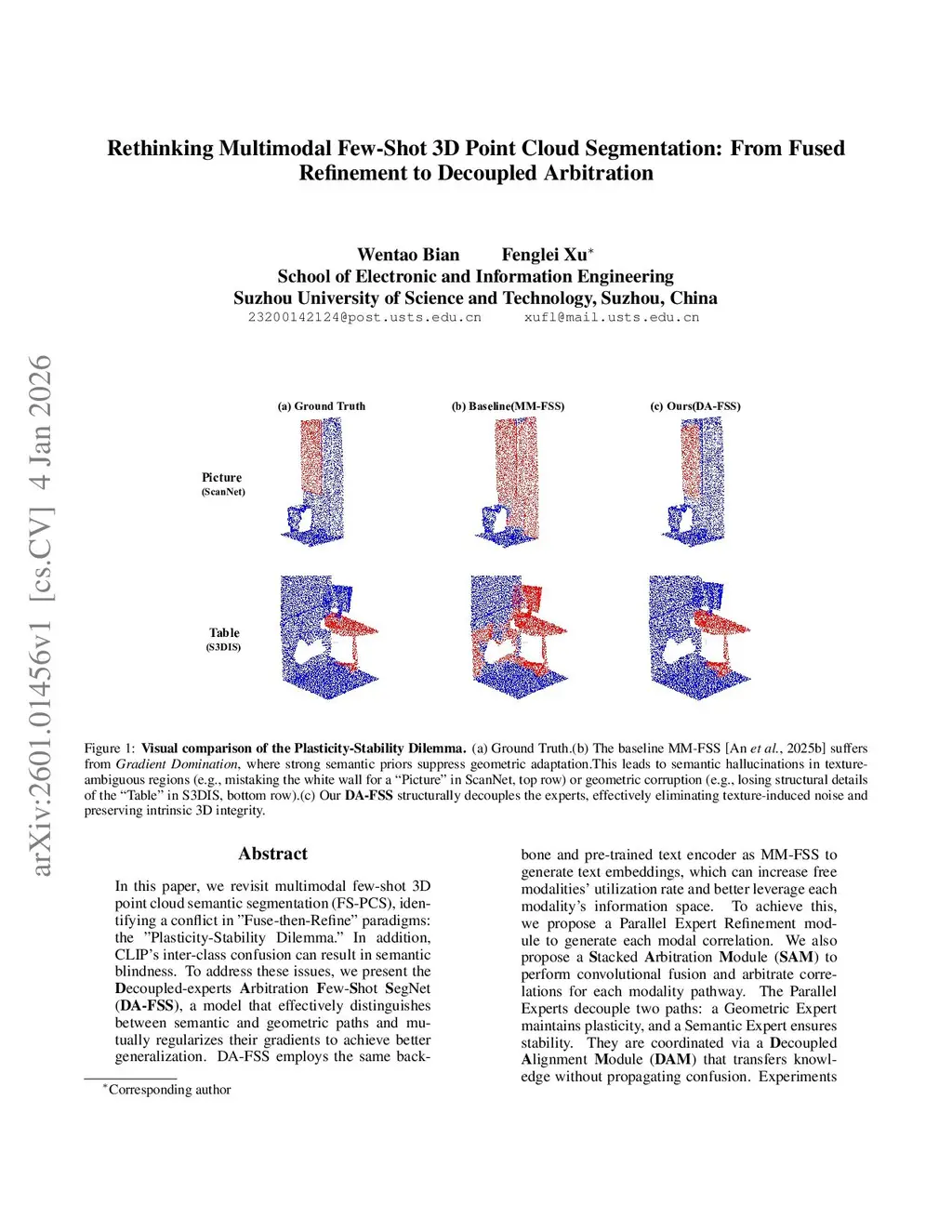 In this paper, we revisit multimodal few-shot 3D point cloud semantic segmentation (FS-PCS), identifying a conflict in "Fuse-then-Refine" paradigms: the "Plasticity-Stability Dilemma." In addition, CLIP's inter-class confusion can result in semantic blindness. To address these issues, we present the Decoupled-experts Arbitration Few-Shot SegNet (DA-FSS), a model that effectively distinguishes between semantic and geometric paths and mutually regularizes their gradients to achieve better generalization. DA-FSS employs the same backbone and pre-trained text encoder as MM-FSS to generate text embeddings, which can increase free modalities' utilization rate and better leverage each modality's information space. To achieve this, we propose a Parallel Expert Refinement module to generate each modal correlation. We also propose a Stacked Arbitration Module (SAM) to perform convolutional fusion and arbitrate correlations for each modality pathway. The Parallel Experts decouple two paths: a Geometric Expert maintains plasticity, and a Semantic Expert ensures stability. They are coordinated via a Decoupled Alignment Module (DAM) that transfers knowledge without propagating confusion. Experiments on popular datasets (S3DIS, ScanNet) demonstrate the superiority of DA-FSS over MM-FSS. Meanwhile, geometric boundaries, completeness, and texture differentiation are all superior to the baseline. The code is available at:this https URL.