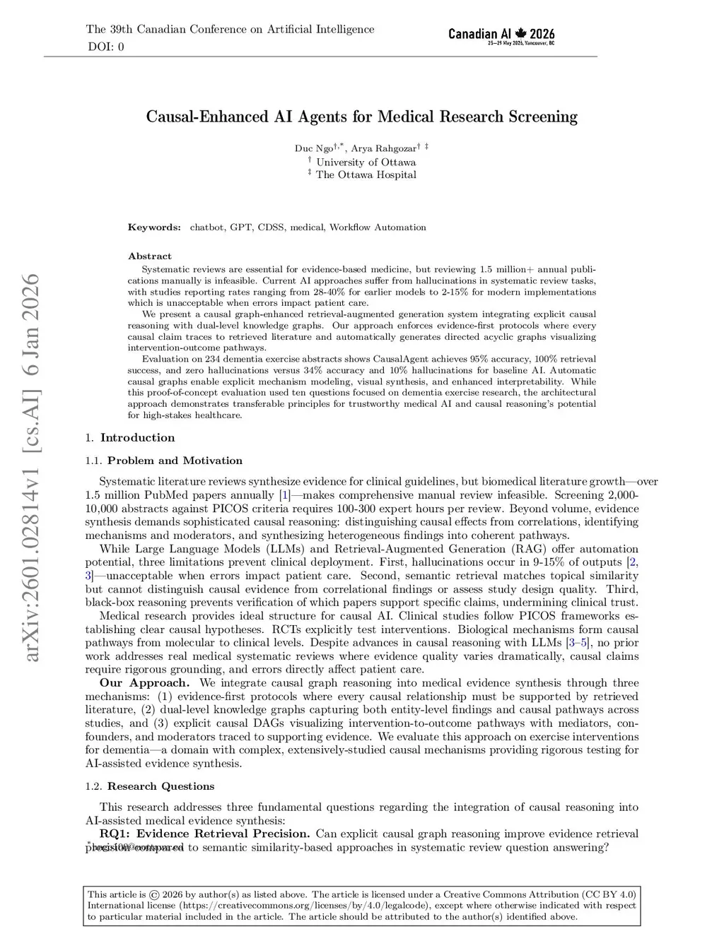 Systematic reviews are essential for evidence-based medicine, but reviewing 1.5 million+ annual publications manually is infeasible. Current AI approaches suffer from hallucinations in systematic review tasks, with studies reporting rates ranging from 28--40% for earlier models to 2--15% for modern implementations which is unacceptable when errors impact patient care.We present a causal graph-enhanced retrieval-augmented generation system integrating explicit causal reasoning with dual-level knowledge graphs. Our approach enforces evidence-first protocols where every causal claim traces to retrieved literature and automatically generates directed acyclic graphs visualizing intervention-outcome pathways.Evaluation on 234 dementia exercise abstracts shows CausalAgent achieves 95% accuracy, 100% retrieval success, and zero hallucinations versus 34% accuracy and 10% hallucinations for baseline AI. Automatic causal graphs enable explicit mechanism modeling, visual synthesis, and enhanced interpretability. While this proof-of-concept evaluation used ten questions focused on dementia exercise research, the architectural approach demonstrates transferable principles for trustworthy medical AI and causal reasoning's potential for high-stakes healthcare.
