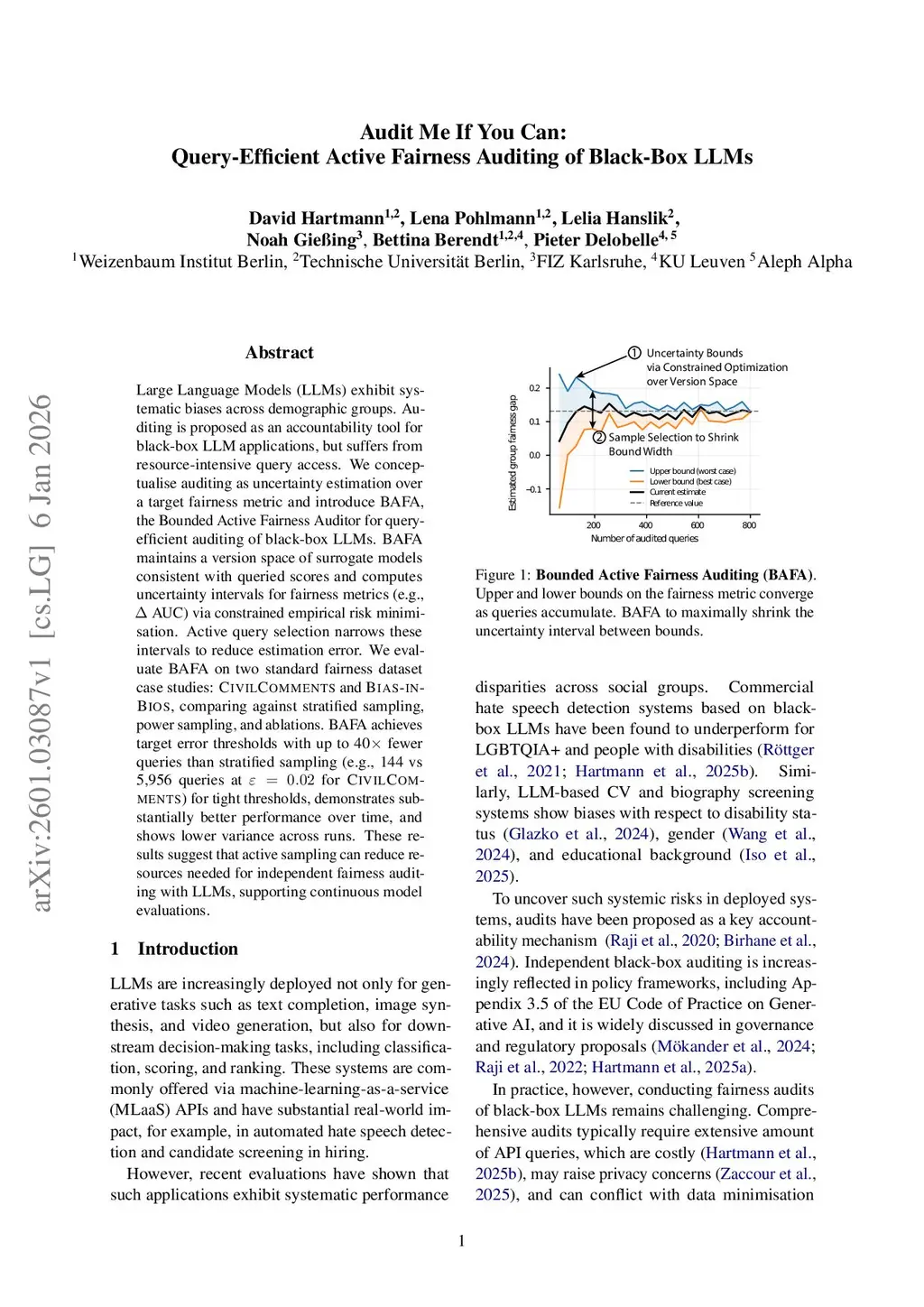 Large Language Models (LLMs) exhibit systematic biases across demographic groups. Auditing is proposed as an accountability tool for black-box LLM applications, but suffers from resource-intensive query access. We conceptualise auditing as uncertainty estimation over a target fairness metric and introduce BAFA, the Bounded Active Fairness Auditor for query-efficient auditing of black-box LLMs. BAFA maintains a version space of surrogate models consistent with queried scores and computes uncertainty intervals for fairness metrics (e.g., AUC) via constrained empirical risk minimisation. Active query selection narrows these intervals to reduce estimation error. We evaluate BAFA on two standard fairness dataset case studies: \textsc{CivilComments} and \textsc{Bias-in-Bios}, comparing against stratified sampling, power sampling, and ablations. BAFA achieves target error thresholds with up to 40 fewer queries than stratified sampling (e.g., 144 vs 5,956 queries at for \textsc{CivilComments}) for tight thresholds, demonstrates substantially better performance over time, and shows lower variance across runs. These results suggest that active sampling can reduce resources needed for independent fairness auditing with LLMs, supporting continuous model evaluations.
