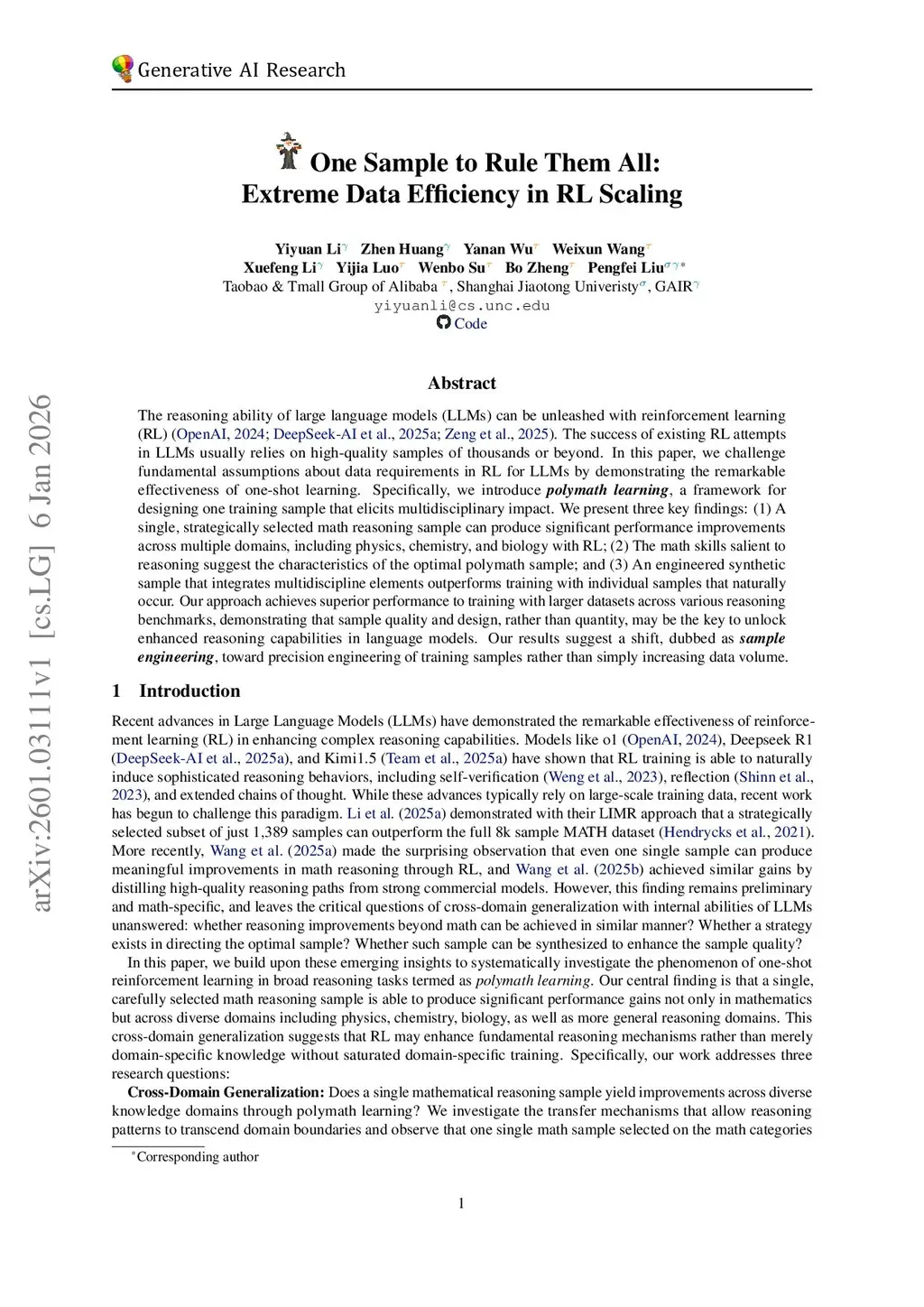 The reasoning ability of large language models (LLMs) can be unleashed with reinforcement learning (RL) (OpenAI, 2024; DeepSeek-AI et al., 2025a; Zeng et al., 2025). The success of existing RL attempts in LLMs usually relies on high-quality samples of thousands or beyond. In this paper, we challenge fundamental assumptions about data requirements in RL for LLMs by demonstrating the remarkable effectiveness of one-shot learning. Specifically, we introduce polymath learning, a framework for designing one training sample that elicits multidisciplinary impact. We present three key findings: (1) A single, strategically selected math reasoning sample can produce significant performance improvements across multiple domains, including physics, chemistry, and biology with RL; (2) The math skills salient to reasoning suggest the characteristics of the optimal polymath sample; and (3) An engineered synthetic sample that integrates multidiscipline elements outperforms training with individual samples that naturally occur. Our approach achieves superior performance to training with larger datasets across various reasoning benchmarks, demonstrating that sample quality and design, rather than quantity, may be the key to unlock enhanced reasoning capabilities in language models. Our results suggest a shift, dubbed as sample engineering, toward precision engineering of training samples rather than simply increasing data volume.