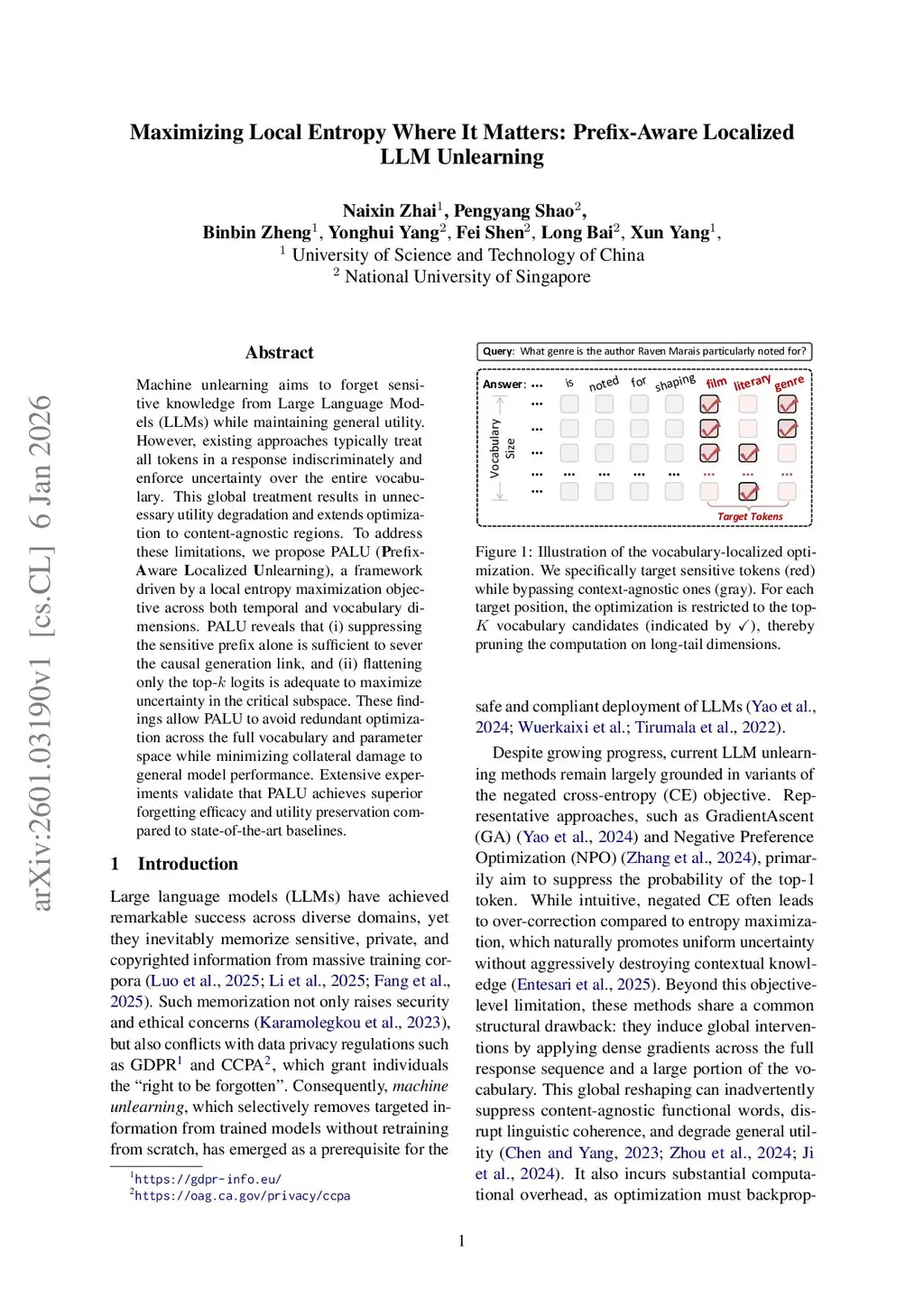 Machine unlearning aims to forget sensitive knowledge from Large Language Models (LLMs) while maintaining general utility. However, existing approaches typically treat all tokens in a response indiscriminately and enforce uncertainty over the entire vocabulary. This global treatment results in unnecessary utility degradation and extends optimization to content-agnostic regions. To address these limitations, we propose PALU (Prefix-Aware Localized Unlearning), a framework driven by a local entropy maximization objective across both temporal and vocabulary dimensions. PALU reveals that (i) suppressing the sensitive prefix alone is sufficient to sever the causal generation link, and (ii) flattening only the top- logits is adequate to maximize uncertainty in the critical subspace. These findings allow PALU to avoid redundant optimization across the full vocabulary and parameter space while minimizing collateral damage to general model performance. Extensive experiments validate that PALU achieves superior forgetting efficacy and utility preservation compared to state-of-the-art baselines.
