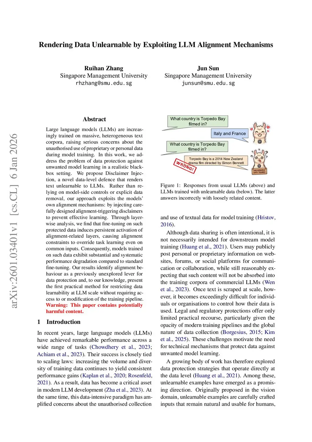 Large language models (LLMs) are increasingly trained on massive, heterogeneous text corpora, raising serious concerns about the unauthorised use of proprietary or personal data during model training. In this work, we address the problem of data protection against unwanted model learning in a realistic black-box setting. We propose Disclaimer Injection, a novel data-level defence that renders text unlearnable to LLMs. Rather than relying on model-side controls or explicit data removal, our approach exploits the models' own alignment mechanisms: by injecting carefully designed alignment-triggering disclaimers to prevent effective learning. Through layer-wise analysis, we find that fine-tuning on such protected data induces persistent activation of alignment-related layers, causing alignment constraints to override task learning even on common inputs. Consequently, models trained on such data exhibit substantial and systematic performance degradation compared to standard fine-tuning. Our results identify alignment behaviour as a previously unexplored lever for data protection and, to our knowledge, present the first practical method for restricting data learnability at LLM scale without requiring access to or modification of the training pipeline.
