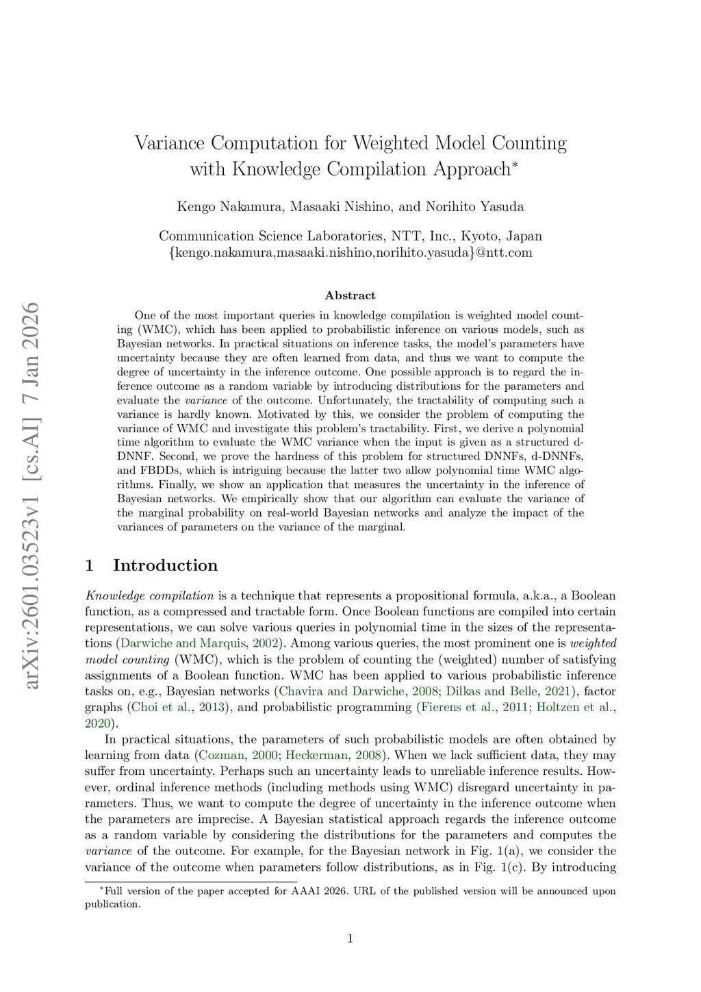 One of the most important queries in knowledge compilation is weighted model counting (WMC), which has been applied to probabilistic inference on various models, such as Bayesian networks. In practical situations on inference tasks, the model's parameters have uncertainty because they are often learned from data, and thus we want to compute the degree of uncertainty in the inference outcome. One possible approach is to regard the inference outcome as a random variable by introducing distributions for the parameters and evaluate the variance of the outcome. Unfortunately, the tractability of computing such a variance is hardly known. Motivated by this, we consider the problem of computing the variance of WMC and investigate this problem's tractability. First, we derive a polynomial time algorithm to evaluate the WMC variance when the input is given as a structured d-DNNF. Second, we prove the hardness of this problem for structured DNNFs, d-DNNFs, and FBDDs, which is intriguing because the latter two allow polynomial time WMC algorithms. Finally, we show an application that measures the uncertainty in the inference of Bayesian networks. We empirically show that our algorithm can evaluate the variance of the marginal probability on real-world Bayesian networks and analyze the impact of the variances of parameters on the variance of the marginal.