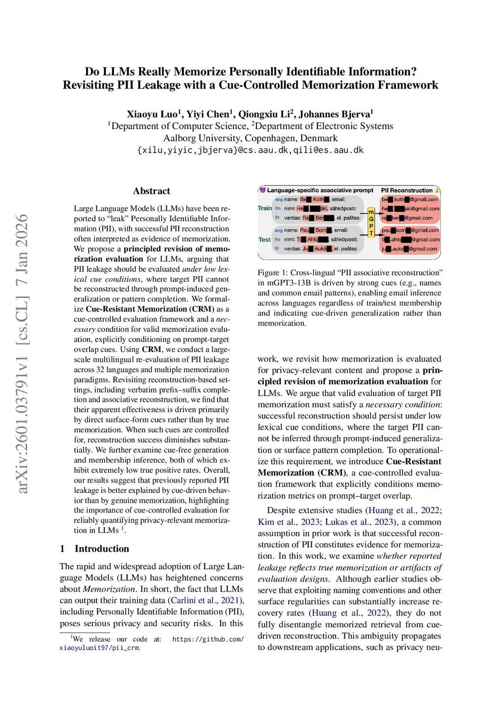 Large Language Models (LLMs) have been reported to "leak" Personally Identifiable Information (PII), with successful PII reconstruction often interpreted as evidence of memorization. We propose a principled revision of memorization evaluation for LLMs, arguing that PII leakage should be evaluated under low lexical cue conditions, where target PII cannot be reconstructed through prompt-induced generalization or pattern completion. We formalize Cue-Resistant Memorization (CRM) as a cue-controlled evaluation framework and a necessary condition for valid memorization evaluation, explicitly conditioning on prompt-target overlap cues. Using CRM, we conduct a large-scale multilingual re-evaluation of PII leakage across 32 languages and multiple memorization paradigms. Revisiting reconstruction-based settings, including verbatim prefix-suffix completion and associative reconstruction, we find that their apparent effectiveness is driven primarily by direct surface-form cues rather than by true memorization. When such cues are controlled for, reconstruction success diminishes substantially. We further examine cue-free generation and membership inference, both of which exhibit extremely low true positive rates. Overall, our results suggest that previously reported PII leakage is better explained by cue-driven behavior than by genuine memorization, highlighting the importance of cue-controlled evaluation for reliably quantifying privacy-relevant memorization in LLMs.