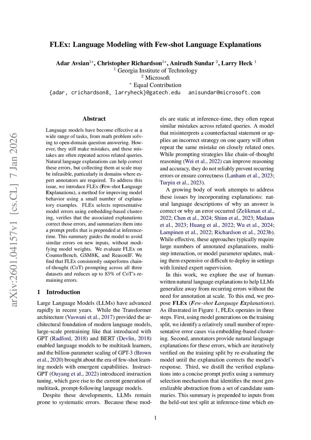 Language models have become effective at a wide range of tasks, from math problem solving to open-domain question answering. However, they still make mistakes, and these mistakes are often repeated across related queries. Natural language explanations can help correct these errors, but collecting them at scale may be infeasible, particularly in domains where expert annotators are required. To address this issue, we introduce FLEx (ew-shot anguage planations), a method for improving model behavior using a small number of explanatory examples. FLEx selects representative model errors using embedding-based clustering, verifies that the associated explanations correct those errors, and summarizes them into a prompt prefix that is prepended at inference-time. This summary guides the model to avoid similar errors on new inputs, without modifying model weights. We evaluate FLEx on CounterBench, GSM8K, and ReasonIF. We find that FLEx consistently outperforms chain-of-thought (CoT) prompting across all three datasets and reduces up to 83\% of CoT's remaining errors.