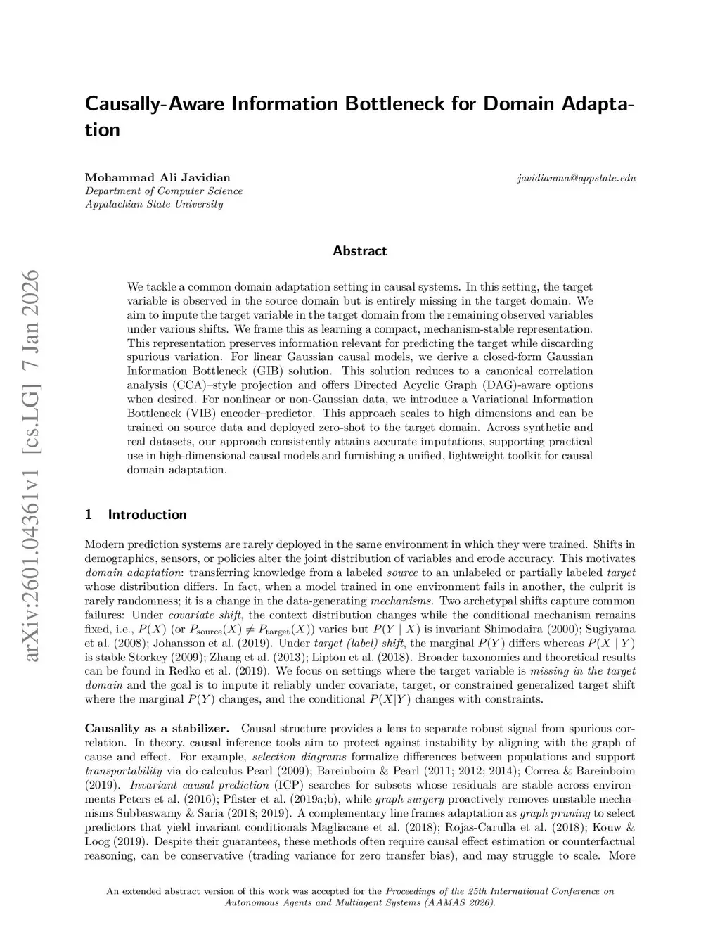 We tackle a common domain adaptation setting in causal systems. In this setting, the target variable is observed in the source domain but is entirely missing in the target domain. We aim to impute the target variable in the target domain from the remaining observed variables under various shifts. We frame this as learning a compact, mechanism-stable representation. This representation preserves information relevant for predicting the target while discarding spurious variation. For linear Gaussian causal models, we derive a closed-form Gaussian Information Bottleneck (GIB) solution. This solution reduces to a canonical correlation analysis (CCA)-style projection and offers Directed Acyclic Graph (DAG)-aware options when desired. For nonlinear or non-Gaussian data, we introduce a Variational Information Bottleneck (VIB) encoder-predictor. This approach scales to high dimensions and can be trained on source data and deployed zero-shot to the target domain. Across synthetic and real datasets, our approach consistently attains accurate imputations, supporting practical use in high-dimensional causal models and furnishing a unified, lightweight toolkit for causal domain adaptation.