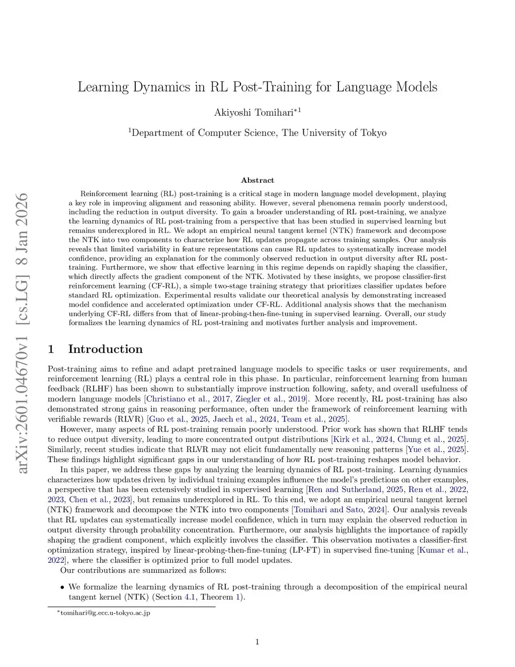 Reinforcement learning (RL) post-training is a critical stage in modern language model development, playing a key role in improving alignment and reasoning ability. However, several phenomena remain poorly understood, including the reduction in output diversity. To gain a broader understanding of RL post-training, we analyze the learning dynamics of RL post-training from a perspective that has been studied in supervised learning but remains underexplored in RL. We adopt an empirical neural tangent kernel (NTK) framework and decompose the NTK into two components to characterize how RL updates propagate across training samples. Our analysis reveals that limited variability in feature representations can cause RL updates to systematically increase model confidence, providing an explanation for the commonly observed reduction in output diversity after RL post-training. Furthermore, we show that effective learning in this regime depends on rapidly shaping the classifier, which directly affects the gradient component of the NTK. Motivated by these insights, we propose classifier-first reinforcement learning (CF-RL), a simple two-stage training strategy that prioritizes classifier updates before standard RL optimization. Experimental results validate our theoretical analysis by demonstrating increased model confidence and accelerated optimization under CF-RL. Additional analysis shows that the mechanism underlying CF-RL differs from that of linear-probing-then-fine-tuning in supervised learning. Overall, our study formalizes the learning dynamics of RL post-training and motivates further analysis and improvement.