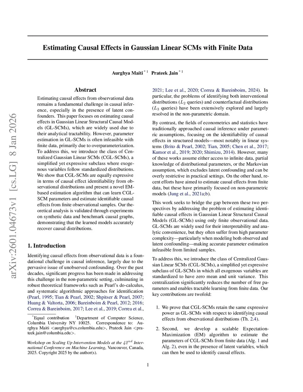 Estimating causal effects from observational data remains a fundamental challenge in causal inference, especially in the presence of latent confounders. This paper focuses on estimating causal effects in Gaussian Linear Structural Causal Models (GL-SCMs), which are widely used due to their analytical tractability. However, parameter estimation in GL-SCMs is often infeasible with finite data, primarily due to overparameterization. To address this, we introduce the class of Centralized Gaussian Linear SCMs (CGL-SCMs), a simplified yet expressive subclass where exogenous variables follow standardized distributions. We show that CGL-SCMs are equally expressive in terms of causal effect identifiability from observational distributions and present a novel EM-based estimation algorithm that can learn CGL-SCM parameters and estimate identifiable causal effects from finite observational samples. Our theoretical analysis is validated through experiments on synthetic data and benchmark causal graphs, demonstrating that the learned models accurately recover causal distributions.