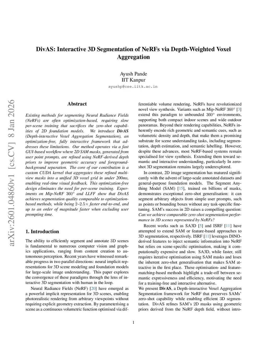 Existing methods for segmenting Neural Radiance Fields (NeRFs) are often optimization-based, requiring slow per-scene training that sacrifices the zero-shot capabilities of 2D foundation models. We introduce DivAS (Depth-interactive Voxel Aggregation Segmentation), an optimization-free, fully interactive framework that addresses these limitations. Our method operates via a fast GUI-based workflow where 2D SAM masks, generated from user point prompts, are refined using NeRF-derived depth priors to improve geometric accuracy and foreground-background separation. The core of our contribution is a custom CUDA kernel that aggregates these refined multi-view masks into a unified 3D voxel grid in under 200ms, enabling real-time visual feedback. This optimization-free design eliminates the need for per-scene training. Experiments on Mip-NeRF 360° and LLFF show that DivAS achieves segmentation quality comparable to optimization-based methods, while being 2-2.5x faster end-to-end, and up to an order of magnitude faster when excluding user prompting time.