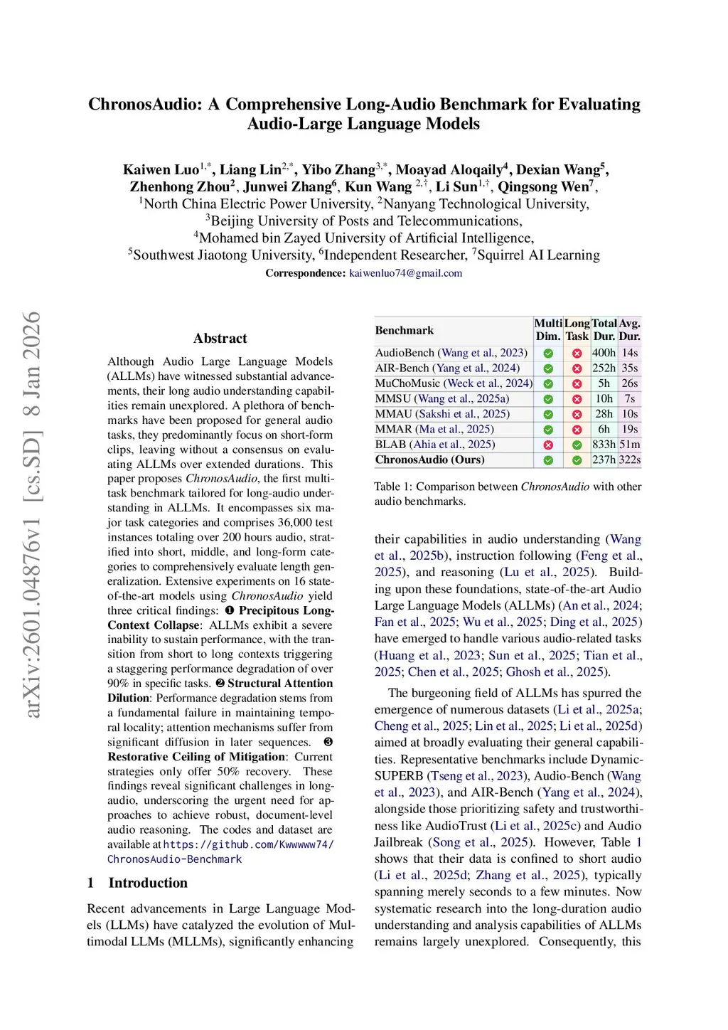 Although Audio Large Language Models (ALLMs) have witnessed substantial advancements, their long audio understanding capabilities remain unexplored. A plethora of benchmarks have been proposed for general audio tasks, they predominantly focus on short-form clips, leaving without a consensus on evaluating ALLMs over extended durations. This paper proposes ChronosAudio, the first multi-task benchmark tailored for long-audio understanding in ALLMs. It encompasses six major task categories and comprises 36,000 test instances totaling over 200 hours audio, stratified into short, middle, and long-form categories to comprehensively evaluate length generalization. Extensive experiments on 16 state-of-the-art models using ChronosAudio yield three critical findings:this http URLLong-Context Collapse: ALLMs exhibit a severe inability to sustain performance, with the transition from short to long contexts triggering a staggering performance degradation of over 90% in specific tasks.this http URLAttention Dilution: Performance degradation stems from a fundamental failure in maintaining temporal locality; attention mechanisms suffer from significant diffusion in later sequences.this http URLCeiling of Mitigation: Current strategies only offer 50% recovery. These findings reveal significant challenges in long-audio, underscoring the urgent need for approaches to achieve robust, document-level audio reasoning.