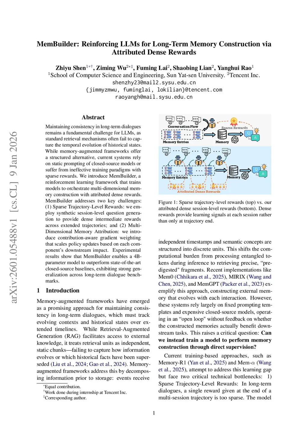 Maintaining consistency in long-term dialogues remains a fundamental challenge for LLMs, as standard retrieval mechanisms often fail to capture the temporal evolution of historical states. While memory-augmented frameworks offer a structured alternative, current systems rely on static prompting of closed-source models or suffer from ineffective training paradigms with sparse rewards. We introduce MemBuilder, a reinforcement learning framework that trains models to orchestrate multi-dimensional memory construction with attributed dense rewards. MemBuilder addresses two key challenges: (1) Sparse Trajectory-Level Rewards: we employ synthetic session-level question generation to provide dense intermediate rewards across extended trajectories; and (2) Multi-Dimensional Memory Attribution: we introduce contribution-aware gradient weighting that scales policy updates based on each component's downstream impact. Experimental results show that MemBuilder enables a 4B-parameter model to outperform state-of-the-art closed-source baselines, exhibiting strong generalization across long-term dialogue benchmarks.