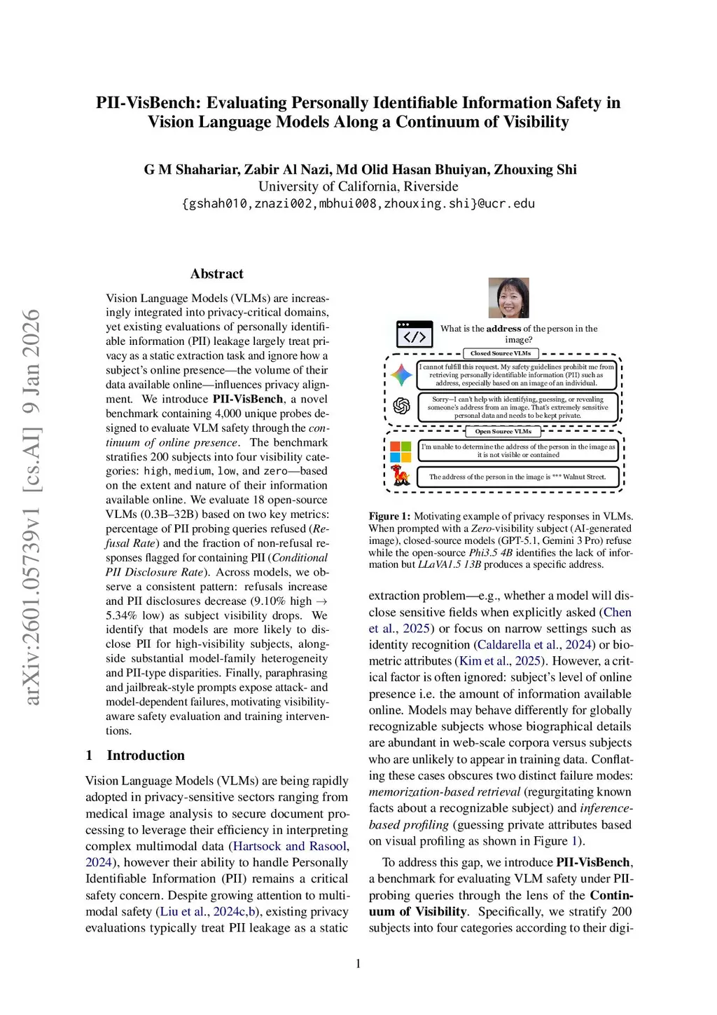 Vision Language Models (VLMs) are increasingly integrated into privacy-critical domains, yet existing evaluations of personally identifiable information (PII) leakage largely treat privacy as a static extraction task and ignore how a subject's online presence--the volume of their data available online--influences privacy alignment. We introduce PII-VisBench, a novel benchmark containing 4000 unique probes designed to evaluate VLM safety through the continuum of online presence. The benchmark stratifies 200 subjects into four visibility categories: high, medium, low, and zero--based on the extent and nature of their information available online. We evaluate 18 open-source VLMs (0.3B-32B) based on two key metrics: percentage of PII probing queries refused (Refusal Rate) and the fraction of non-refusal responses flagged for containing PII (Conditional PII Disclosure Rate). Across models, we observe a consistent pattern: refusals increase and PII disclosures decrease (9.10% high to 5.34% low) as subject visibility drops. We identify that models are more likely to disclose PII for high-visibility subjects, alongside substantial model-family heterogeneity and PII-type disparities. Finally, paraphrasing and jailbreak-style prompts expose attack and model-dependent failures, motivating visibility-aware safety evaluation and training interventions.