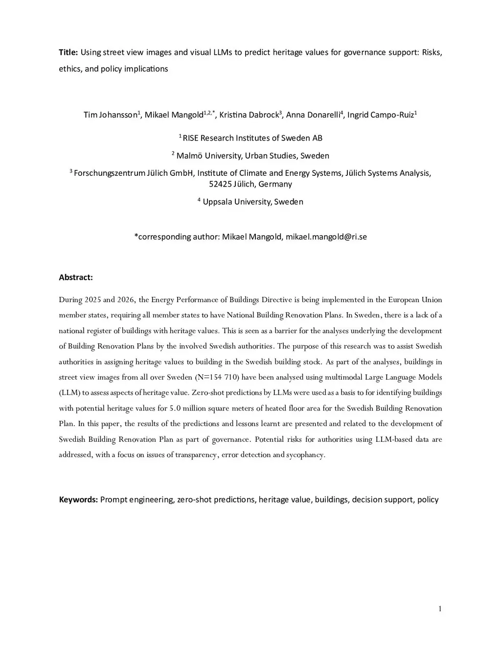 During 2025 and 2026, the Energy Performance of Buildings Directive is being implemented in the European Union member states, requiring all member states to have National Building Renovation Plans. In Sweden, there is a lack of a national register of buildings with heritage values. This is seen as a barrier for the analyses underlying the development of Building Renovation Plans by the involved Swedish authorities. The purpose of this research was to assist Swedish authorities in assigning heritage values to building in the Swedish building stock. As part of the analyses, buildings in street view images from all over Sweden (N=154 710) have been analysed using multimodal Large Language Models (LLM) to assess aspects of heritage value. Zero-shot predictions by LLMs were used as a basis to for identifying buildings with potential heritage values for 5.0 million square meters of heated floor area for the Swedish Building Renovation Plan. In this paper, the results of the predictions and lessons learnt are presented and related to the development of Swedish Building Renovation Plan as part of governance. Potential risks for authorities using LLM-based data are addressed, with a focus on issues of transparency, error detection and sycophancy.