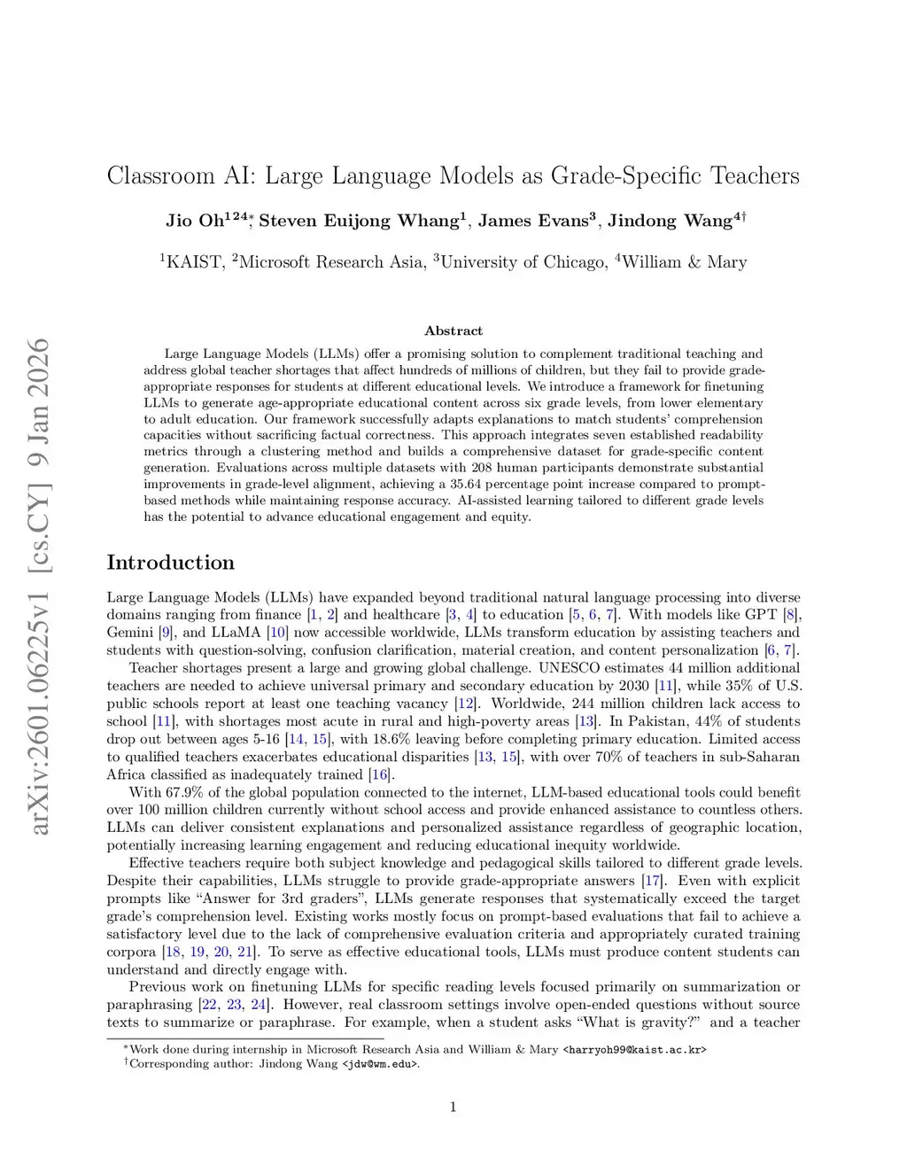 Large Language Models (LLMs) offer a promising solution to complement traditional teaching and address global teacher shortages that affect hundreds of millions of children, but they fail to provide grade-appropriate responses for students at different educational levels. We introduce a framework for finetuning LLMs to generate age-appropriate educational content across six grade levels, from lower elementary to adult education. Our framework successfully adapts explanations to match students' comprehension capacities without sacrificing factual correctness. This approach integrates seven established readability metrics through a clustering method and builds a comprehensive dataset for grade-specific content generation. Evaluations across multiple datasets with 208 human participants demonstrate substantial improvements in grade-level alignment, achieving a 35.64 percentage point increase compared to prompt-based methods while maintaining response accuracy. AI-assisted learning tailored to different grade levels has the potential to advance educational engagement and equity.