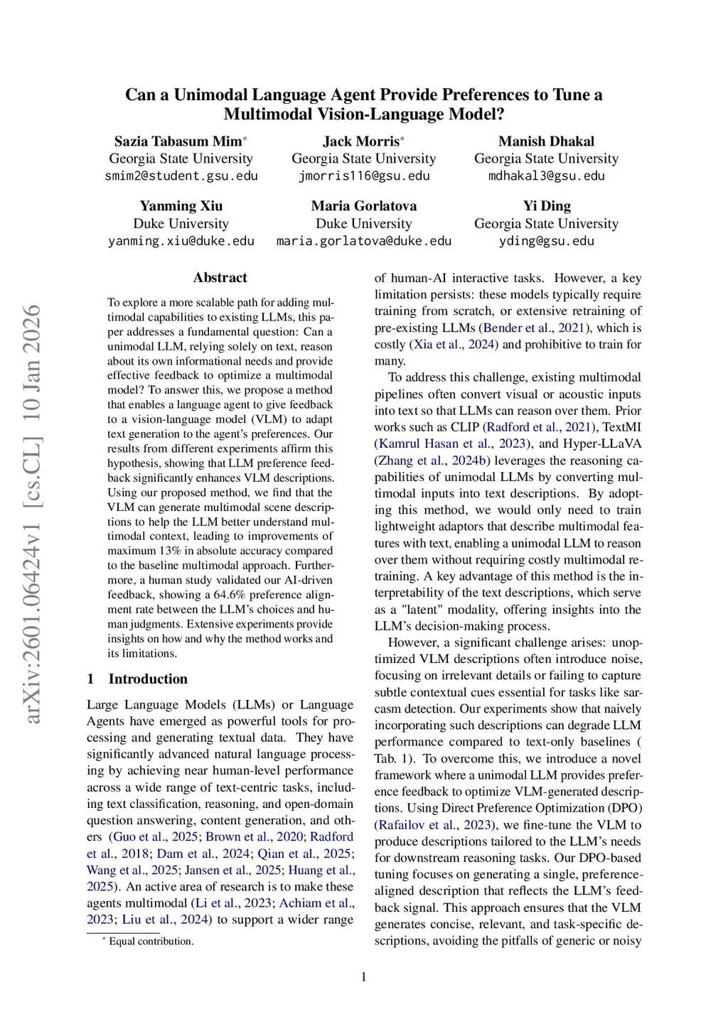 To explore a more scalable path for adding multimodal capabilities to existing LLMs, this paper addresses a fundamental question: Can a unimodal LLM, relying solely on text, reason about its own informational needs and provide effective feedback to optimize a multimodal model? To answer this, we propose a method that enables a language agent to give feedback to a vision-language model (VLM) to adapt text generation to the agent's preferences. Our results from different experiments affirm this hypothesis, showing that LLM preference feedback significantly enhances VLM descriptions. Using our proposed method, we find that the VLM can generate multimodal scene descriptions to help the LLM better understand multimodal context, leading to improvements of maximum 13% in absolute accuracy compared to the baseline multimodal approach. Furthermore, a human study validated our AI-driven feedback, showing a 64.6% preference alignment rate between the LLM's choices and human judgments. Extensive experiments provide insights on how and why the method works and its limitations.