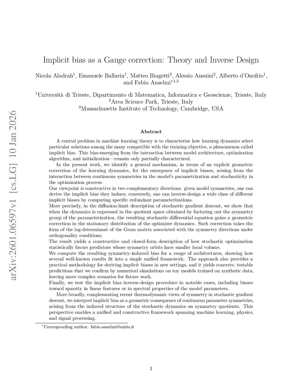 A central problem in machine learning theory is to characterize how learning dynamics select particular solutions among the many compatible with the training objective, a phenomenon, called implicit bias, which remains only partially characterized. In the present work, we identify a general mechanism, in terms of an explicit geometric correction of the learning dynamics, for the emergence of implicit biases, arising from the interaction between continuous symmetries in the model's parametrization and stochasticity in the optimization process. Our viewpoint is constructive in two complementary directions: given model symmetries, one can derive the implicit bias they induce; conversely, one can inverse-design a wide class of different implicit biases by computing specific redundant parameterizations. More precisely, we show that, when the dynamics is expressed in the quotient space obtained by factoring out the symmetry group of the parameterization, the resulting stochastic differential equation gains a closed form geometric correction in the stationary distribution of the optimizer dynamics favoring orbits with small local volume. We compute the resulting symmetry induced bias for a range of architectures, showing how several well known results fit into a single unified framework. The approach also provides a practical methodology for deriving implicit biases in new settings, and it yields concrete, testable predictions that we confirm by numerical simulations on toy models trained on synthetic data, leaving more complex scenarios for future work. Finally, we test the implicit bias inverse-design procedure in notable cases, including biases toward sparsity in linear features or in spectral properties of the model parameters.