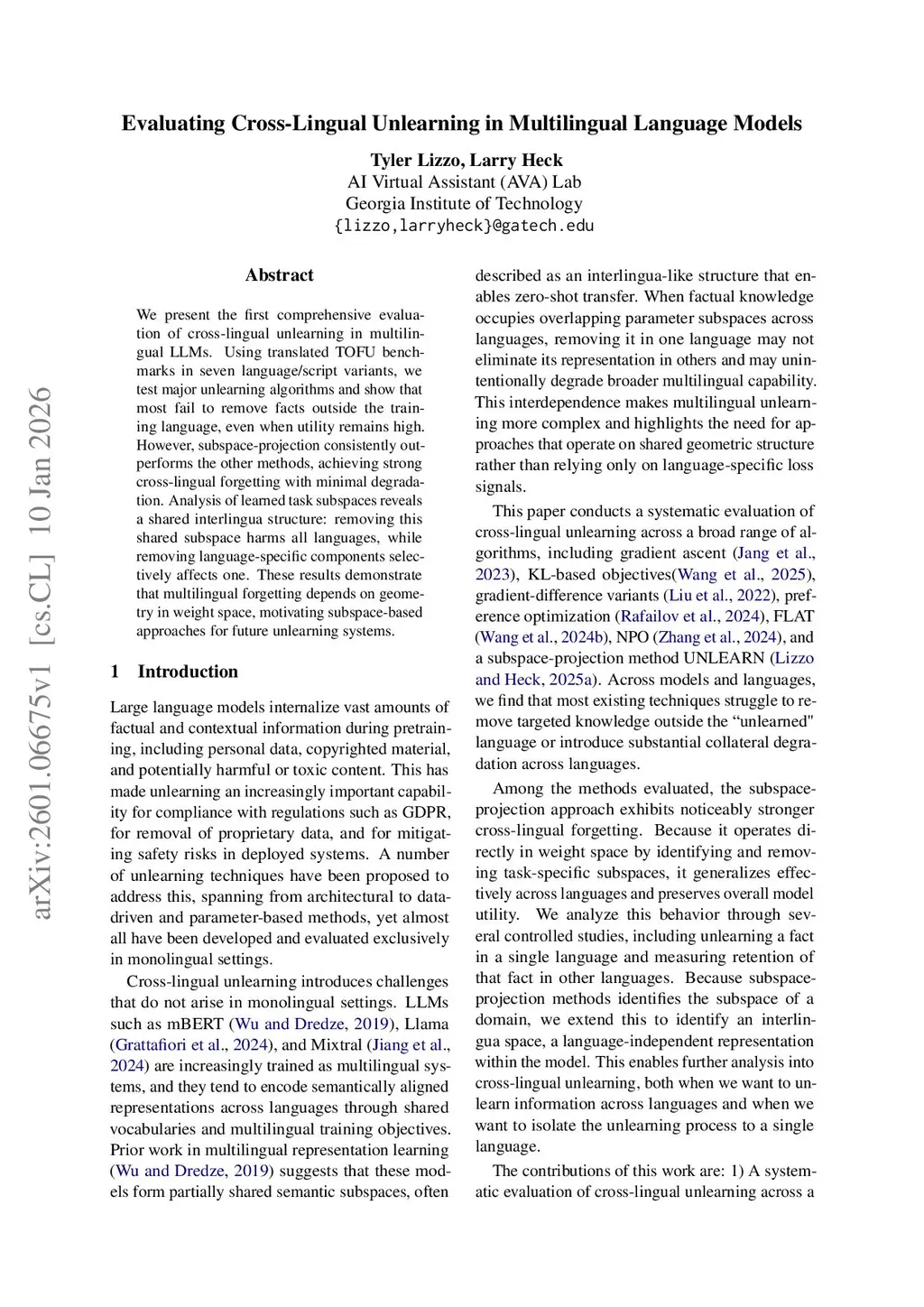 We present the first comprehensive evaluation of cross-lingual unlearning in multilingual LLMs. Using translated TOFU benchmarks in seven language/script variants, we test major unlearning algorithms and show that most fail to remove facts outside the training language, even when utility remains high. However, subspace-projection consistently outperforms the other methods, achieving strong cross-lingual forgetting with minimal degradation. Analysis of learned task subspaces reveals a shared interlingua structure: removing this shared subspace harms all languages, while removing language-specific components selectively affects one. These results demonstrate that multilingual forgetting depends on geometry in weight space, motivating subspace-based approaches for future unlearning systems.