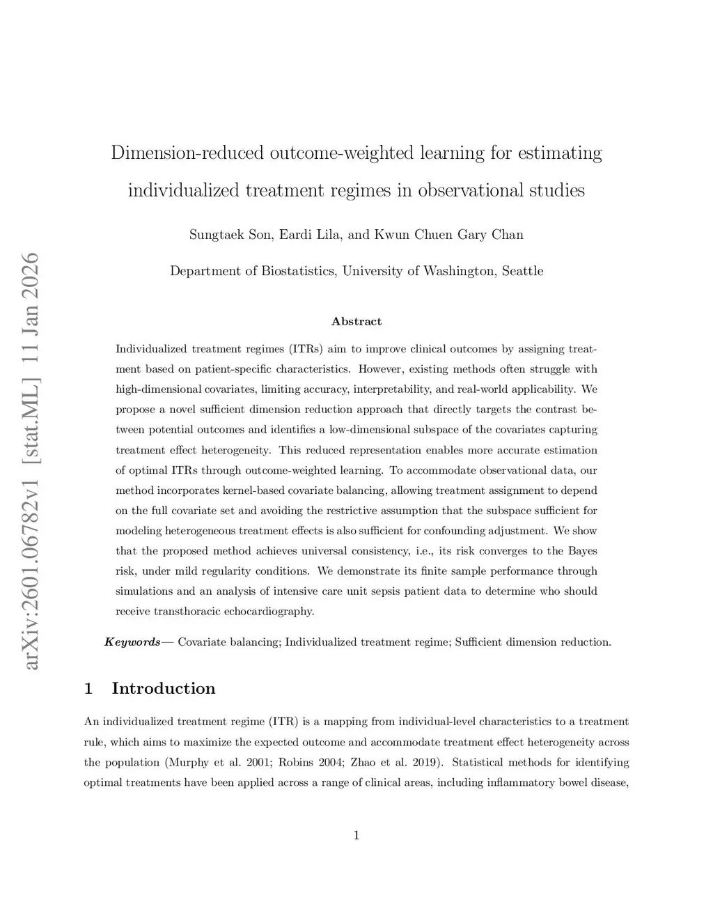 Individualized treatment regimes (ITRs) aim to improve clinical outcomes by assigning treatment based on patient-specific characteristics. However, existing methods often struggle with high-dimensional covariates, limiting accuracy, interpretability, and real-world applicability. We propose a novel sufficient dimension reduction approach that directly targets the contrast between potential outcomes and identifies a low-dimensional subspace of the covariates capturing treatment effect heterogeneity. This reduced representation enables more accurate estimation of optimal ITRs through outcome-weighted learning. To accommodate observational data, our method incorporates kernel-based covariate balancing, allowing treatment assignment to depend on the full covariate set and avoiding the restrictive assumption that the subspace sufficient for modeling heterogeneous treatment effects is also sufficient for confounding adjustment. We show that the proposed method achieves universal consistency, i.e., its risk converges to the Bayes risk, under mild regularity conditions. We demonstrate its finite sample performance through simulations and an analysis of intensive care unit sepsis patient data to determine who should receive transthoracic echocardiography.