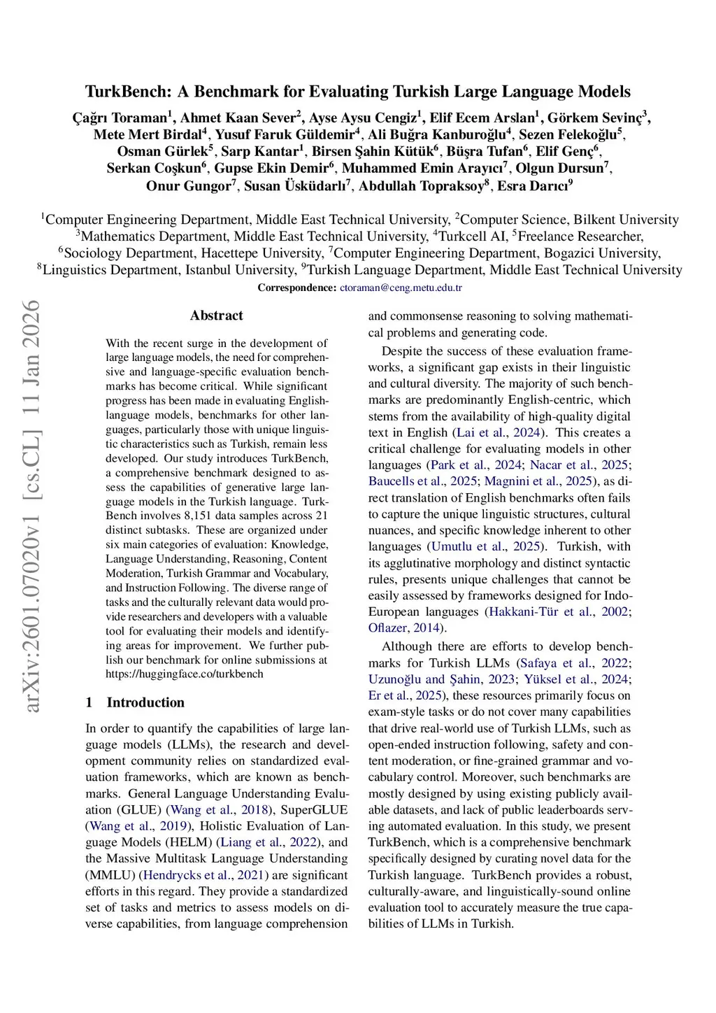 With the recent surge in the development of large language models, the need for comprehensive and language-specific evaluation benchmarks has become critical. While significant progress has been made in evaluating English-language models, benchmarks for other languages, particularly those with unique linguistic characteristics such as Turkish, remain less developed. Our study introduces TurkBench, a comprehensive benchmark designed to assess the capabilities of generative large language models in the Turkish language. TurkBench involves 8,151 data samples across 21 distinct subtasks. These are organized under six main categories of evaluation: Knowledge, Language Understanding, Reasoning, Content Moderation, Turkish Grammar and Vocabulary, and Instruction Following. The diverse range of tasks and the culturally relevant data would provide researchers and developers with a valuable tool for evaluating their models and identifying areas for improvement. We further publish our benchmark for online submissions atthis https URL