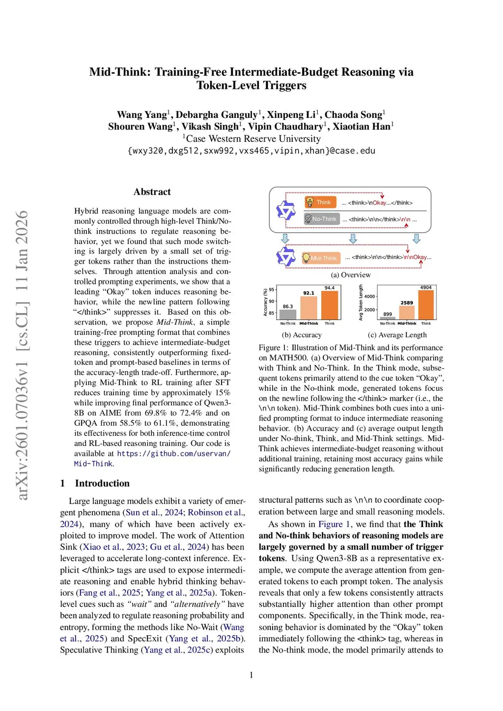 Hybrid reasoning language models are commonly controlled through high-level Think/No-think instructions to regulate reasoning behavior, yet we found that such mode switching is largely driven by a small set of trigger tokens rather than the instructions themselves. Through attention analysis and controlled prompting experiments, we show that a leading ``Okay'' token induces reasoning behavior, while the newline pattern following ``</think>'' suppresses it. Based on this observation, we propose Mid-Think, a simple training-free prompting format that combines these triggers to achieve intermediate-budget reasoning, consistently outperforming fixed-token and prompt-based baselines in terms of the accuracy-length trade-off. Furthermore, applying Mid-Think to RL training after SFT reduces training time by approximately 15% while improving final performance of Qwen3-8B on AIME from 69.8% to 72.4% and on GPQA from 58.5% to 61.1%, demonstrating its effectiveness for both inference-time control and RL-based reasoning training.
