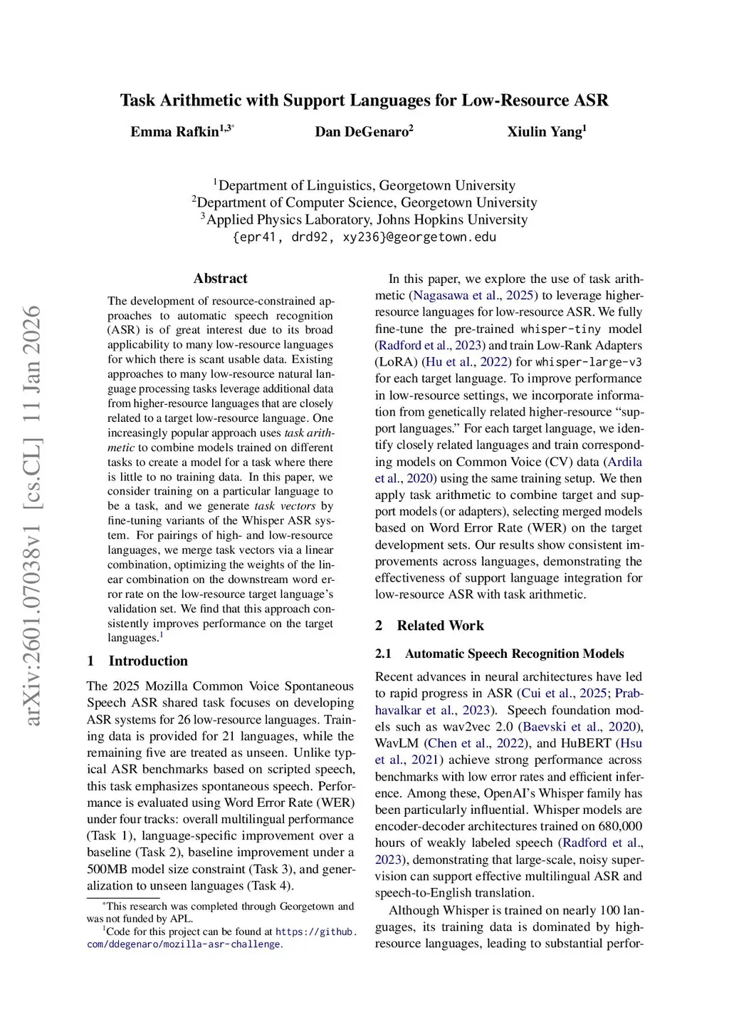 Task Arithmetic with Support Languages for Low-Resource ASR