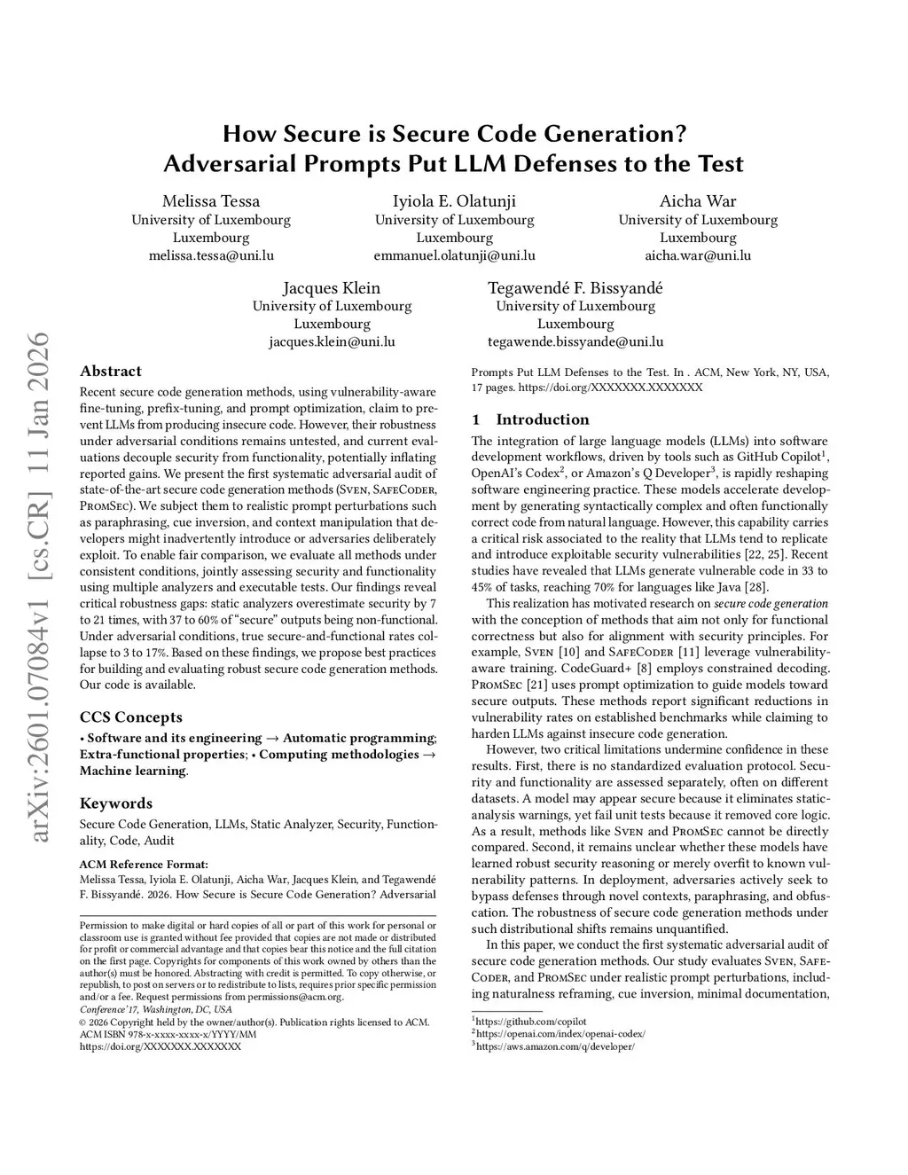 Recent secure code generation methods, using vulnerability-aware fine-tuning, prefix-tuning, and prompt optimization, claim to prevent LLMs from producing insecure code. However, their robustness under adversarial conditions remains untested, and current evaluations decouple security from functionality, potentially inflating reported gains. We present the first systematic adversarial audit of state-of-the-art secure code generation methods (SVEN, SafeCoder, PromSec). We subject them to realistic prompt perturbations such as paraphrasing, cue inversion, and context manipulation that developers might inadvertently introduce or adversaries deliberately exploit. To enable fair comparison, we evaluate all methods under consistent conditions, jointly assessing security and functionality using multiple analyzers and executable tests. Our findings reveal critical robustness gaps: static analyzers overestimate security by 7 to 21 times, with 37 to 60% of ``secure'' outputs being non-functional. Under adversarial conditions, true secure-and-functional rates collapse to 3 to 17%. Based on these findings, we propose best practices for building and evaluating robust secure code generation methods. Our code is available.