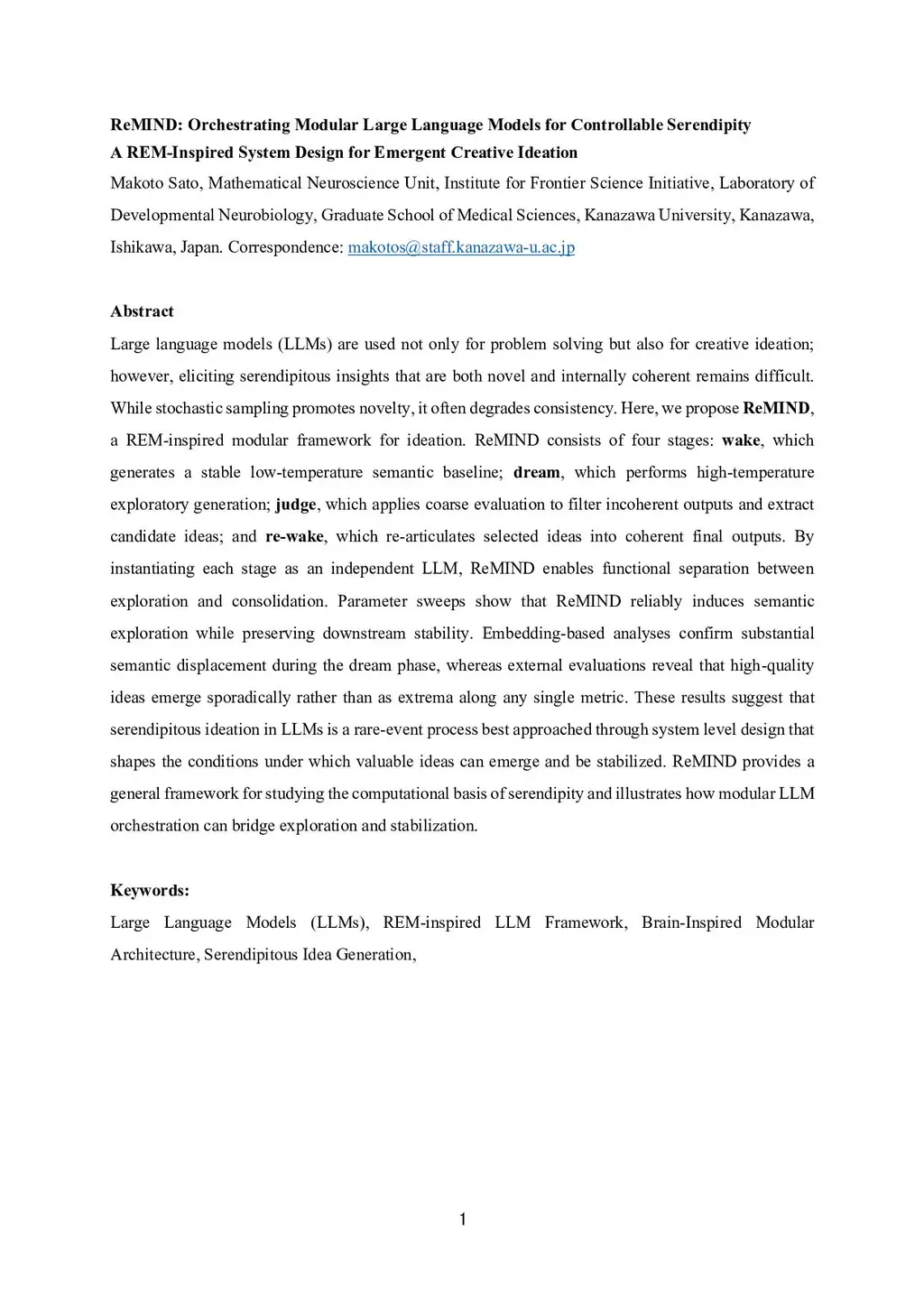Large language models (LLMs) are used not only for problem solving but also for creative ideation; however, eliciting serendipitous insights that are both novel and internally coherent remains difficult. While stochastic sampling promotes novelty, it often degrades consistency. Here, we propose ReMIND, a REM-inspired modular framework for ideation. ReMIND consists of four stages: wake, which generates a stable low-temperature semantic baseline; dream, which performs high-temperature exploratory generation; judge, which applies coarse evaluation to filter incoherent outputs and extract candidate ideas; and re-wake, which re-articulates selected ideas into coherent final outputs. By instantiating each stage as an independent LLM, ReMIND enables functional separation between exploration and consolidation. Parameter sweeps show that ReMIND reliably induces semantic exploration while preserving downstream stability. Embedding-based analyses confirm substantial semantic displacement during the dream phase, whereas external evaluations reveal that high-quality ideas emerge sporadically rather than as extrema along any single metric. These results suggest that serendipitous ideation in LLMs is a rare-event process best approached through system level design that shapes the conditions under which valuable ideas can emerge and be stabilized. ReMIND provides a general framework for studying the computational basis of serendipity and illustrates how modular LLM orchestration can bridge exploration and stabilization.
