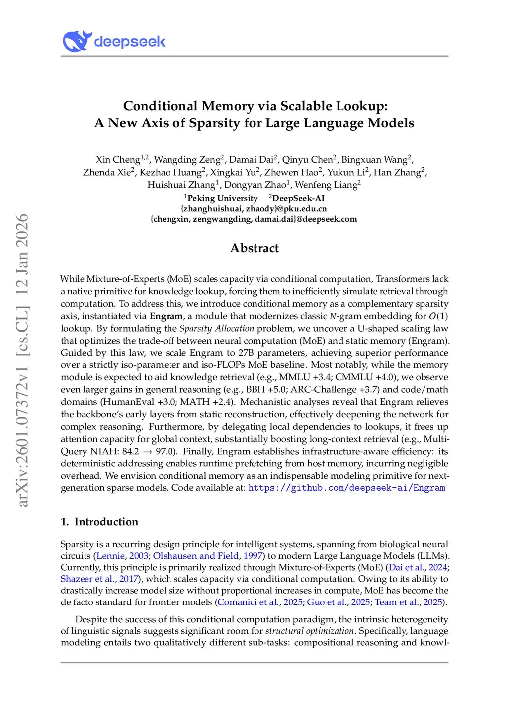 While Mixture-of-Experts (MoE) scales capacity via conditional computation, Transformers lack a native primitive for knowledge lookup, forcing them to inefficiently simulate retrieval through computation. To address this, we introduce conditional memory as a complementary sparsity axis, instantiated via Engram, a module that modernizes classic -gram embedding for O(1) lookup. By formulating the Sparsity Allocation problem, we uncover a U-shaped scaling law that optimizes the trade-off between neural computation (MoE) and static memory (Engram). Guided by this law, we scale Engram to 27B parameters, achieving superior performance over a strictly iso-parameter and iso-FLOPs MoE baseline. Most notably, while the memory module is expected to aid knowledge retrieval (e.g., MMLU +3.4; CMMLU +4.0), we observe even larger gains in general reasoning (e.g., BBH +5.0; ARC-Challenge +3.7) and code/math domains~(HumanEval +3.0; MATH +2.4). Mechanistic analyses reveal that Engram relieves the backbone's early layers from static reconstruction, effectively deepening the network for complex reasoning. Furthermore, by delegating local dependencies to lookups, it frees up attention capacity for global context, substantially boosting long-context retrieval (e.g., Multi-Query NIAH: 84.2 to 97.0). Finally, Engram establishes infrastructure-aware efficiency: its deterministic addressing enables runtime prefetching from host memory, incurring negligible overhead. We envision conditional memory as an indispensable modeling primitive for next-generation sparse models.