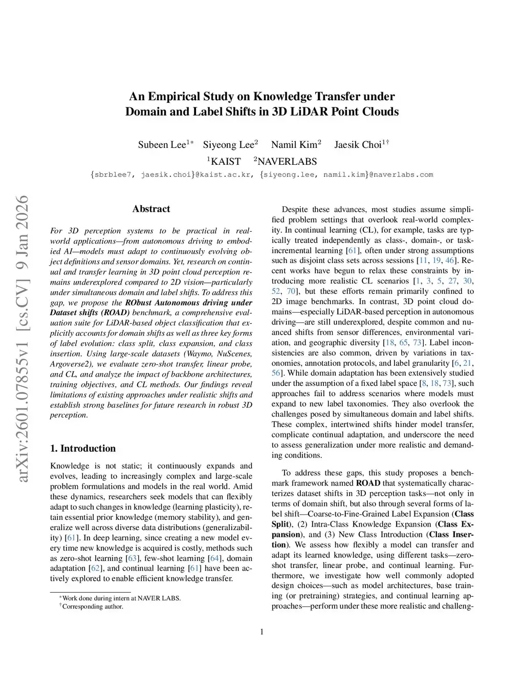 For 3D perception systems to be practical in real-world applications -- from autonomous driving to embodied AI -- models must adapt to continuously evolving object definitions and sensor domains. Yet, research on continual and transfer learning in 3D point cloud perception remains underexplored compared to 2D vision -- particularly under simultaneous domain and label shifts. To address this gap, we propose the RObust Autonomous driving under Dataset shifts (ROAD) benchmark, a comprehensive evaluation suite for LiDAR-based object classification that explicitly accounts for domain shifts as well as three key forms of label evolution: class split, class expansion, and class insertion. Using large-scale datasets (Waymo, NuScenes, Argoverse2), we evaluate zero-shot transfer, linear probe, and CL, and analyze the impact of backbone architectures, training objectives, and CL methods. Our findings reveal limitations of existing approaches under realistic shifts and establish strong baselines for future research in robust 3D perception.