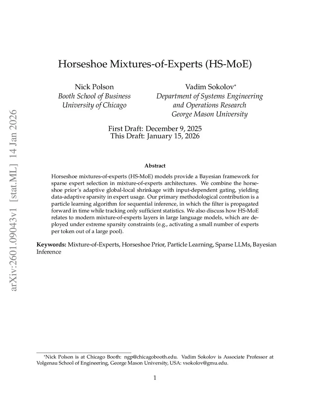 Horseshoe mixtures-of-experts (HS-MoE) models provide a Bayesian framework for sparse expert selection in mixture-of-experts architectures. We combine the horseshoe prior's adaptive global-local shrinkage with input-dependent gating, yielding data-adaptive sparsity in expert usage. Our primary methodological contribution is a particle learning algorithm for sequential inference, in which the filter is propagated forward in time while tracking only sufficient statistics. We also discuss how HS-MoE relates to modern mixture-of-experts layers in large language models, which are deployed under extreme sparsity constraints (e.g., activating a small number of experts per token out of a large pool).