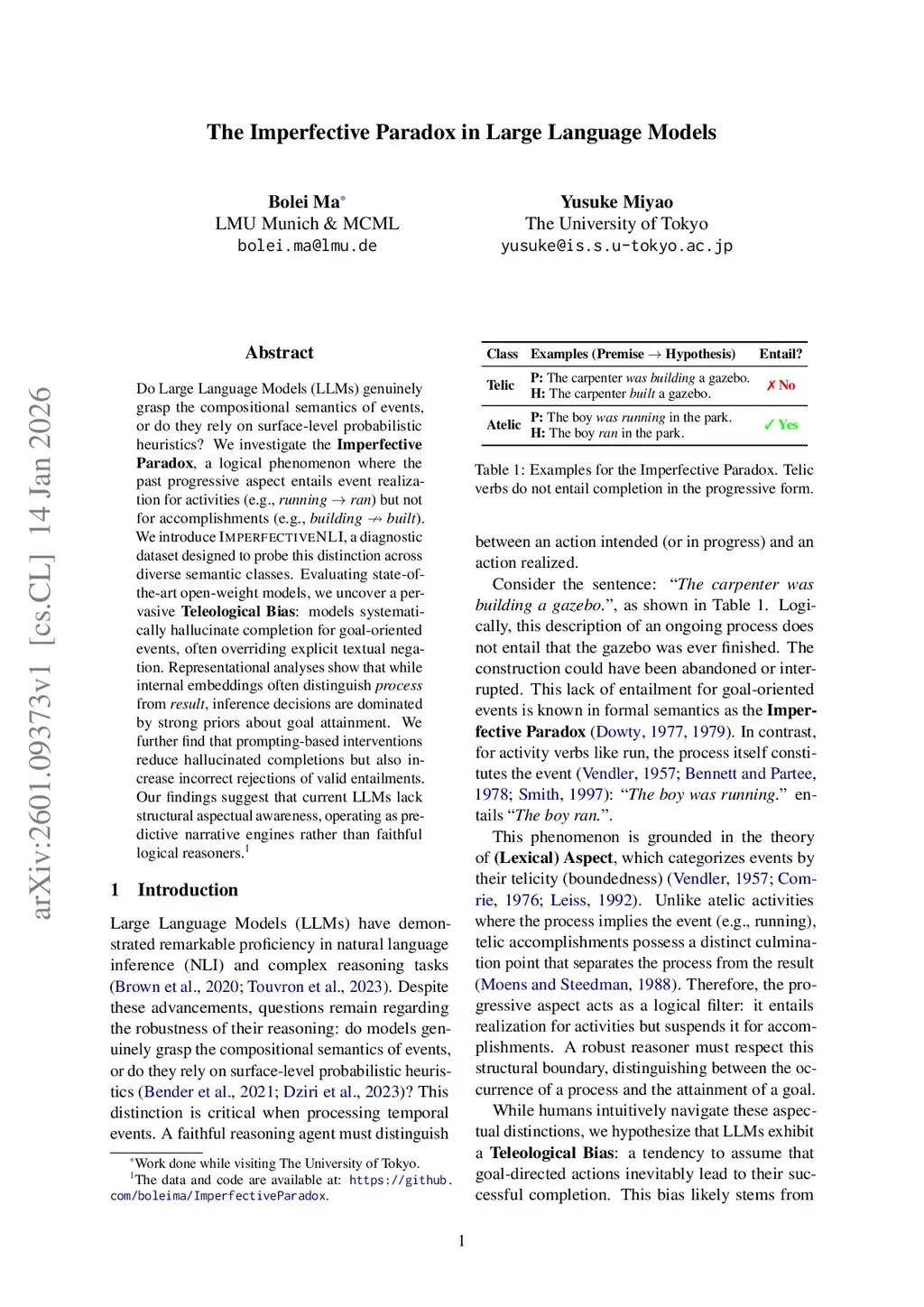 Do Large Language Models (LLMs) genuinely grasp the compositional semantics of events, or do they rely on surface-level probabilistic heuristics? We investigate the Imperfective Paradox, a logical phenomenon where the past progressive aspect entails event realization for activities (e.g., running ran) but not for accomplishments (e.g., building built). We introduce ImperfectiveNLI, a diagnostic dataset designed to probe this distinction across diverse semantic classes. Evaluating state-of-the-art open-weight models, we uncover a pervasive Teleological Bias: models systematically hallucinate completion for goal-oriented events, often overriding explicit textual negation. Representational analyses show that while internal embeddings often distinguish process from result, inference decisions are dominated by strong priors about goal attainment. We further find that prompting-based interventions reduce hallucinated completions but also increase incorrect rejections of valid entailments. Our findings suggest that current LLMs lack structural aspectual awareness, operating as predictive narrative engines rather than faithful logical reasoners.