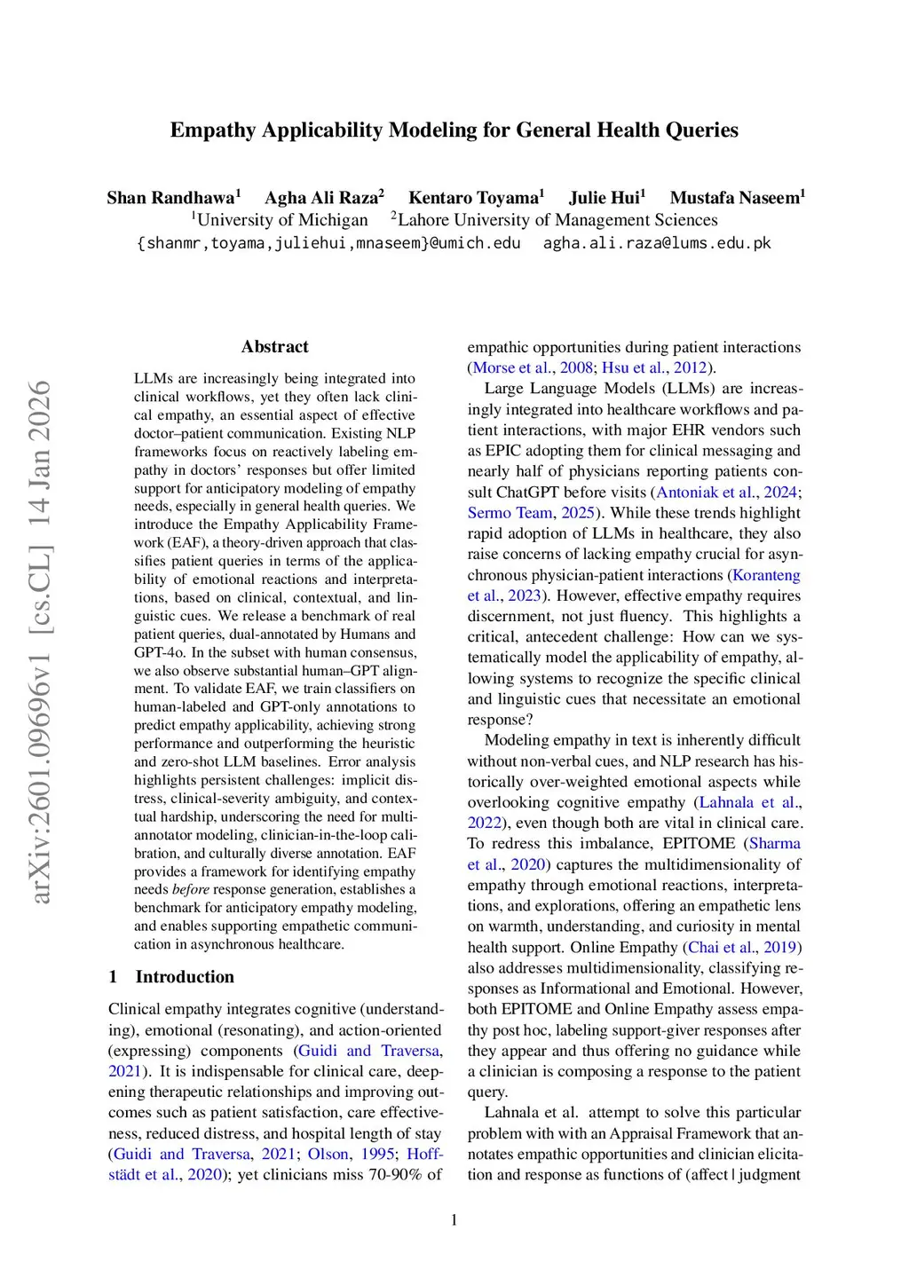 LLMs are increasingly being integrated into clinical workflows, yet they often lack clinical empathy, an essential aspect of effective doctor-patient communication. Existing NLP frameworks focus on reactively labeling empathy in doctors' responses but offer limited support for anticipatory modeling of empathy needs, especially in general health queries. We introduce the Empathy Applicability Framework (EAF), a theory-driven approach that classifies patient queries in terms of the applicability of emotional reactions and interpretations, based on clinical, contextual, and linguistic cues. We release a benchmark of real patient queries, dual-annotated by Humans and GPT-4o. In the subset with human consensus, we also observe substantial human-GPT alignment. To validate EAF, we train classifiers on human-labeled and GPT-only annotations to predict empathy applicability, achieving strong performance and outperforming the heuristic and zero-shot LLM baselines. Error analysis highlights persistent challenges: implicit distress, clinical-severity ambiguity, and contextual hardship, underscoring the need for multi-annotator modeling, clinician-in-the-loop calibration, and culturally diverse annotation. EAF provides a framework for identifying empathy needs before response generation, establishes a benchmark for anticipatory empathy modeling, and enables supporting empathetic communication in asynchronous healthcare.