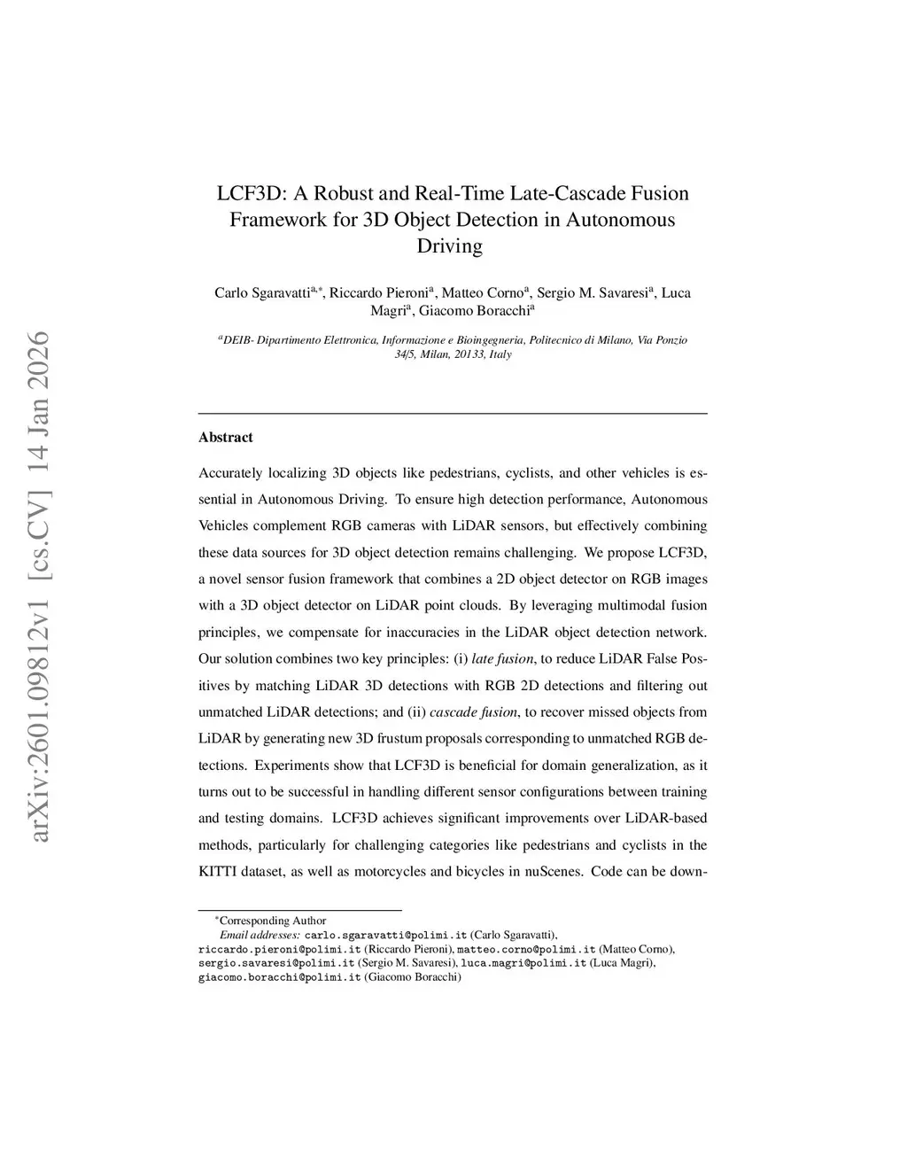 Accurately localizing 3D objects like pedestrians, cyclists, and other vehicles is essential in Autonomous Driving. To ensure high detection performance, Autonomous Vehicles complement RGB cameras with LiDAR sensors, but effectively combining these data sources for 3D object detection remains challenging. We propose LCF3D, a novel sensor fusion framework that combines a 2D object detector on RGB images with a 3D object detector on LiDAR point clouds. By leveraging multimodal fusion principles, we compensate for inaccuracies in the LiDAR object detection network. Our solution combines two key principles: (i) late fusion, to reduce LiDAR False Positives by matching LiDAR 3D detections with RGB 2D detections and filtering out unmatched LiDAR detections; and (ii) cascade fusion, to recover missed objects from LiDAR by generating new 3D frustum proposals corresponding to unmatched RGB detections. Experiments show that LCF3D is beneficial for domain generalization, as it turns out to be successful in handling different sensor configurations between training and testing domains. LCF3D achieves significant improvements over LiDAR-based methods, particularly for challenging categories like pedestrians and cyclists in the KITTI dataset, as well as motorcycles and bicycles in nuScenes. Code can be downloaded from:this https URL.