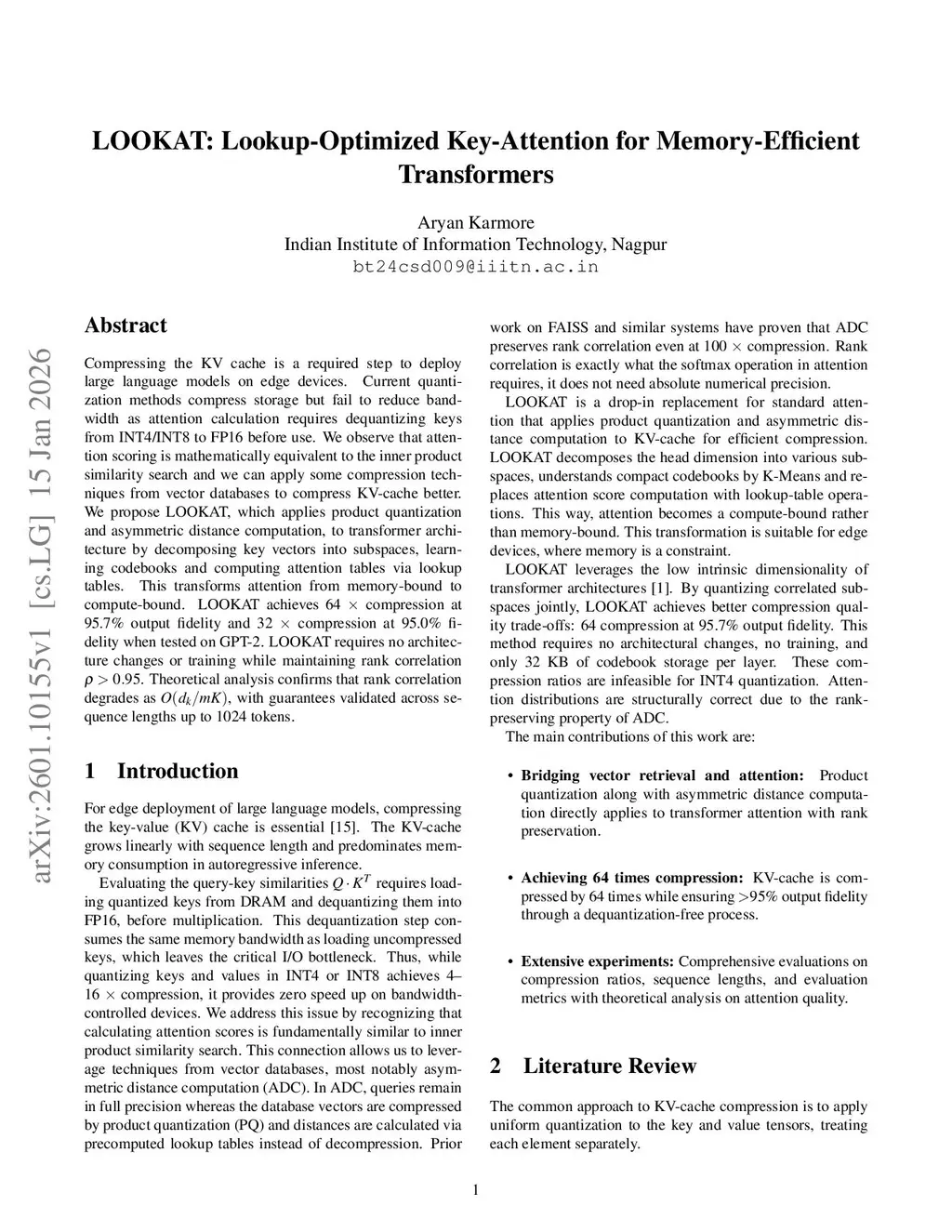 Compressing the KV cache is a required step to deploy large language models on edge devices. Current quantization methods compress storage but fail to reduce bandwidth as attention calculation requires dequantizing keys from INT4/INT8 to FP16 before use. We observe that attention scoring is mathematically equivalent to the inner product similarity search and we can apply some compression techniques from vector databases to compress KV-cache better. We propose LOOKAT, which applies product quantization and asymmetric distance computation, to transformer architecture by decomposing key vectors into subspaces, learning codebooks and computing attention tables via lookup tables. This transforms attention from memory-bound to compute-bound. LOOKAT achieves 64 compression at 95.7\% output fidelity and 32 compression at 95.0\% fidelity when tested on GPT-2. LOOKAT requires no architecture changes or training while maintaining rank correlation . Theoretical analysis confirms that rank correlation degrades as , with guarantees validated across sequence lengths up to 1024 tokens.