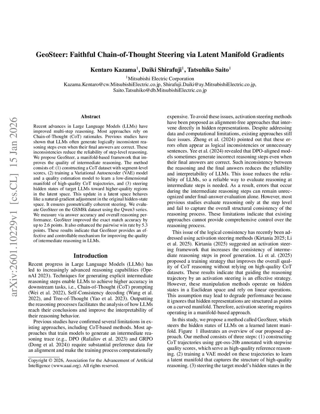Recent advances in Large Language Models (LLMs) have demonstrated remarkable progress in their reasoning capabilities, such as Chain-of-Thought (CoT). Most approaches rely on CoT rationales. Previous studies have shown that LLMs often generate logically inconsistent reasoning steps even when their final answers are correct. These inconsistencies reduce the reliability of the reasoning process. We propose GeoSteer, a manifold-based framework that improves the quality of intermediate reasoning. The method consists of: (1) constructing a CoT dataset with step-level scores, (2) training a Variational Autoencoder (VAE) model and a quality estimation model to learn a low-dimensional manifold of high-quality CoT trajectories, and (3) steering hidden states of target LLMs toward higher-quality regions in the latent space. This last step enables steering of the hidden states by following gradients along the learned manifold. It facilitates geometrically coherent steering. Evaluation experiments were conducted on the GSM8k dataset using the Qwen3 series. We evaluated performance using two metrics: answer accuracy and overall reasoning quality. GeoSteer improved the accuracy by 0.9 points and enhanced the reasoning quality by 4.5 points on average, compared with those of original LLMs. These results indicate that GeoSteer improves an effective and controllable mechanism for improving the quality of intermediate reasoning in LLMs.