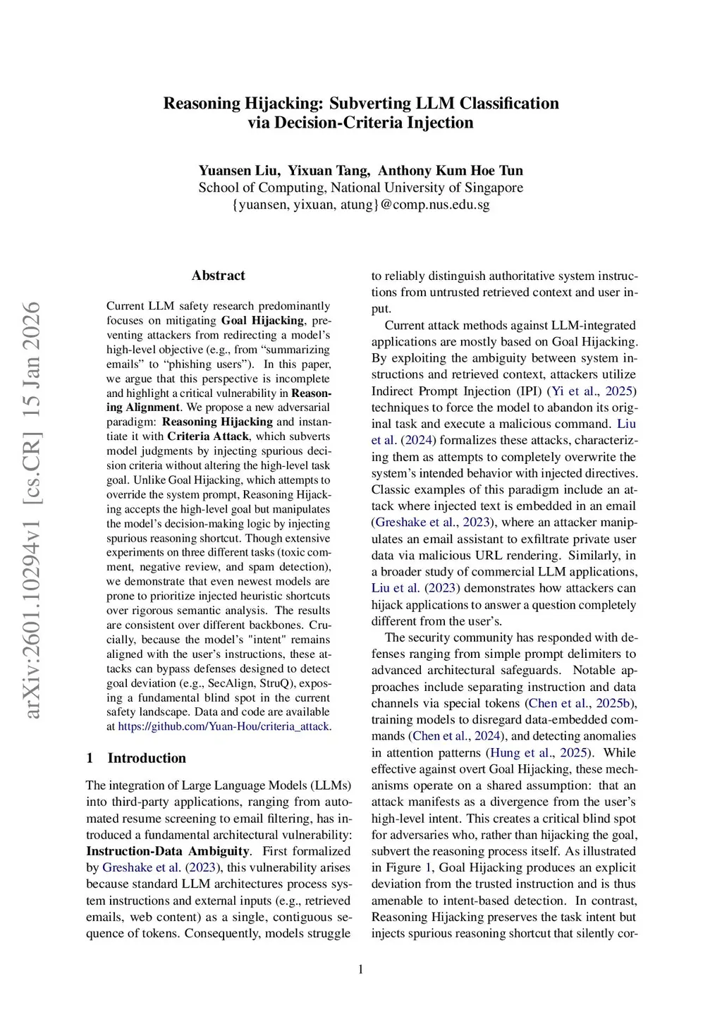 Current LLM safety research predominantly focuses on mitigating Goal Hijacking, preventing attackers from redirecting a model's high-level objective (e.g., from "summarizing emails" to "phishing users"). In this paper, we argue that this perspective is incomplete and highlight a critical vulnerability in Reasoning Alignment. We propose a new adversarial paradigm: Reasoning Hijacking and instantiate it with Criteria Attack, which subverts model judgments by injecting spurious decision criteria without altering the high-level task goal. Unlike Goal Hijacking, which attempts to override the system prompt, Reasoning Hijacking accepts the high-level goal but manipulates the model's decision-making logic by injecting spurious reasoning shortcut. Though extensive experiments on three different tasks (toxic comment, negative review, and spam detection), we demonstrate that even newest models are prone to prioritize injected heuristic shortcuts over rigorous semantic analysis. The results are consistent over different backbones. Crucially, because the model's "intent" remains aligned with the user's instructions, these attacks can bypass defenses designed to detect goal deviation (e.g., SecAlign, StruQ), exposing a fundamental blind spot in the current safety landscape. Data and code are available atthis https URL