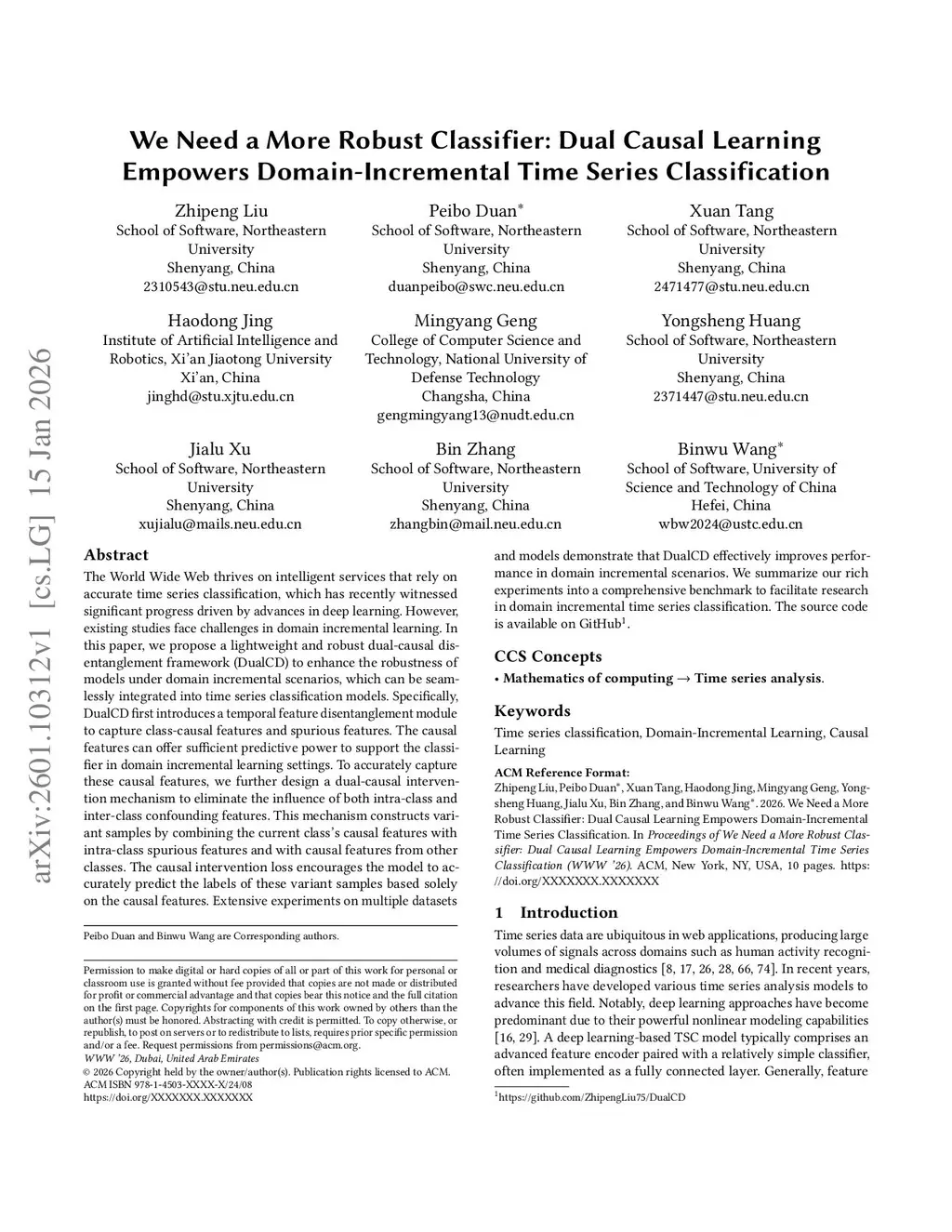 The World Wide Web thrives on intelligent services that rely on accurate time series classification, which has recently witnessed significant progress driven by advances in deep learning. However, existing studies face challenges in domain incremental learning. In this paper, we propose a lightweight and robust dual-causal disentanglement framework (DualCD) to enhance the robustness of models under domain incremental scenarios, which can be seamlessly integrated into time series classification models. Specifically, DualCD first introduces a temporal feature disentanglement module to capture class-causal features and spurious features. The causal features can offer sufficient predictive power to support the classifier in domain incremental learning settings. To accurately capture these causal features, we further design a dual-causal intervention mechanism to eliminate the influence of both intra-class and inter-class confounding features. This mechanism constructs variant samples by combining the current class's causal features with intra-class spurious features and with causal features from other classes. The causal intervention loss encourages the model to accurately predict the labels of these variant samples based solely on the causal features. Extensive experiments on multiple datasets and models demonstrate that DualCD effectively improves performance in domain incremental scenarios. We summarize our rich experiments into a comprehensive benchmark to facilitate research in domain incremental time series classification.
