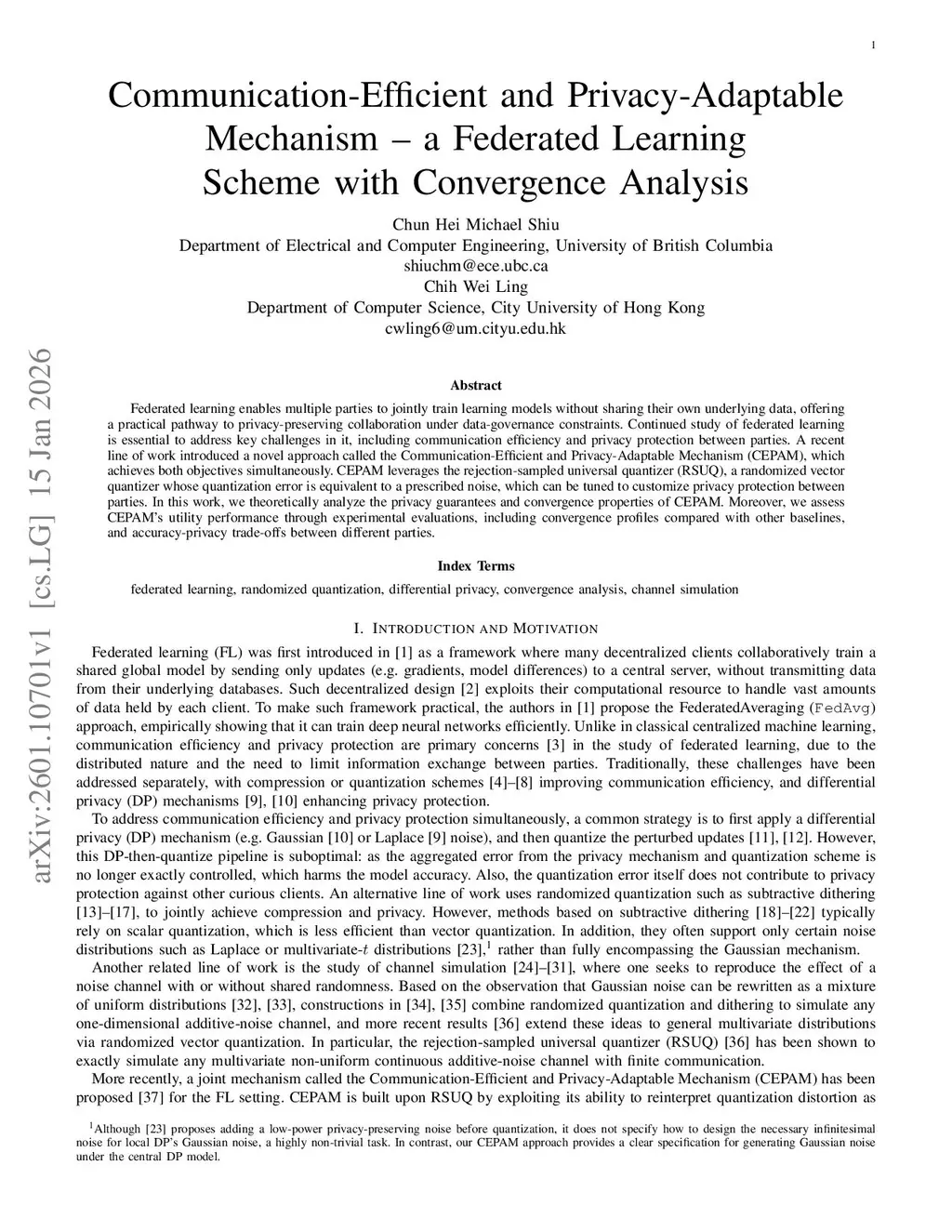 Federated learning enables multiple parties to jointly train learning models without sharing their own underlying data, offering a practical pathway to privacy-preserving collaboration under data-governance constraints. Continued study of federated learning is essential to address key challenges in it, including communication efficiency and privacy protection between parties. A recent line of work introduced a novel approach called the Communication-Efficient and Privacy-Adaptable Mechanism (CEPAM), which achieves both objectives simultaneously. CEPAM leverages the rejection-sampled universal quantizer (RSUQ), a randomized vector quantizer whose quantization error is equivalent to a prescribed noise, which can be tuned to customize privacy protection between parties. In this work, we theoretically analyze the privacy guarantees and convergence properties of CEPAM. Moreover, we assess CEPAM's utility performance through experimental evaluations, including convergence profiles compared with other baselines, and accuracy-privacy trade-offs between different parties.