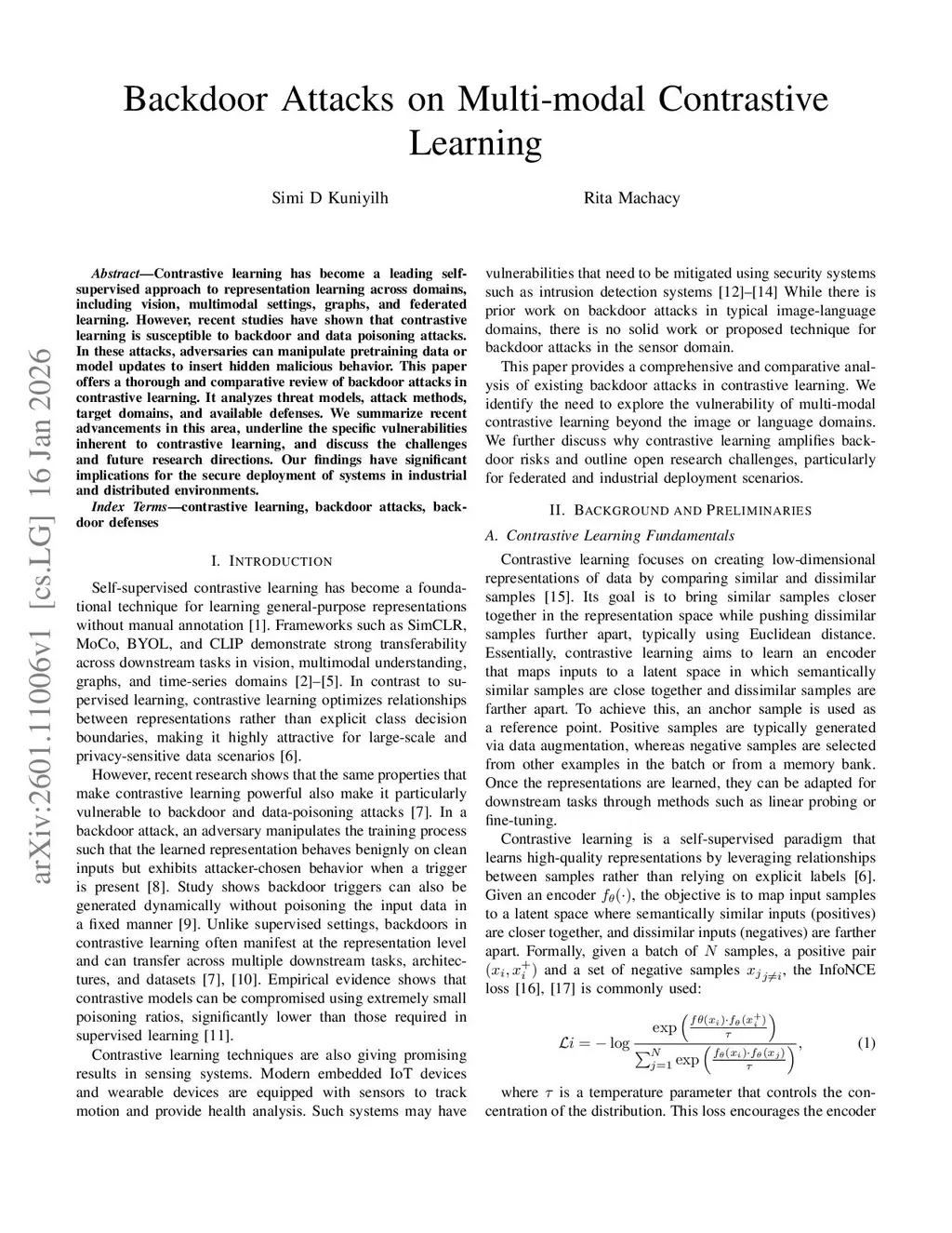 Contrastive learning has become a leading self- supervised approach to representation learning across domains, including vision, multimodal settings, graphs, and federated learning. However, recent studies have shown that contrastive learning is susceptible to backdoor and data poisoning attacks. In these attacks, adversaries can manipulate pretraining data or model updates to insert hidden malicious behavior. This paper offers a thorough and comparative review of backdoor attacks in contrastive learning. It analyzes threat models, attack methods, target domains, and available defenses. We summarize recent advancements in this area, underline the specific vulnerabilities inherent to contrastive learning, and discuss the challenges and future research directions. Our findings have significant implications for the secure deployment of systems in industrial and distributed environments.