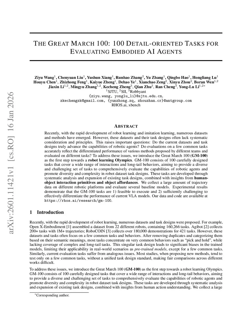 Recently, with the rapid development of robot learning and imitation learning, numerous datasets and methods have emerged. However, these datasets and their task designs often lack systematic consideration and principles. This raises important questions: Do the current datasets and task designs truly advance the capabilities of robotic agents? Do evaluations on a few common tasks accurately reflect the differentiated performance of various methods proposed by different teams and evaluated on different tasks? To address these issues, we introduce the Great March 100 (\textbf{GM-100}) as the first step towards a robot learning Olympics. GM-100 consists of 100 carefully designed tasks that cover a wide range of interactions and long-tail behaviors, aiming to provide a diverse and challenging set of tasks to comprehensively evaluate the capabilities of robotic agents and promote diversity and complexity in robot dataset task designs. These tasks are developed through systematic analysis and expansion of existing task designs, combined with insights from human-object interaction primitives and object affordances. We collect a large amount of trajectory data on different robotic platforms and evaluate several baseline models. Experimental results demonstrate that the GM-100 tasks are 1) feasible to execute and 2) sufficiently challenging to effectively differentiate the performance of current VLA models. Our data and code are available atthis https URL.