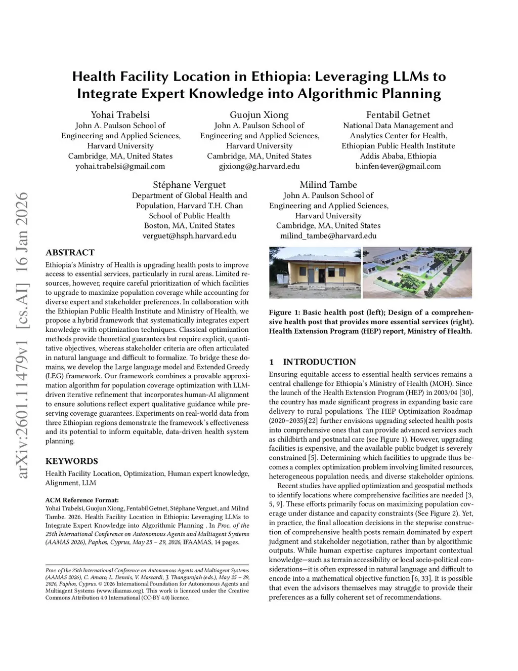 Ethiopia's Ministry of Health is upgrading health posts to improve access to essential services, particularly in rural areas. Limited resources, however, require careful prioritization of which facilities to upgrade to maximize population coverage while accounting for diverse expert and stakeholder preferences. In collaboration with the Ethiopian Public Health Institute and Ministry of Health, we propose a hybrid framework that systematically integrates expert knowledge with optimization techniques. Classical optimization methods provide theoretical guarantees but require explicit, quantitative objectives, whereas stakeholder criteria are often articulated in natural language and difficult to formalize. To bridge these domains, we develop the Large language model and Extended Greedy (LEG) framework. Our framework combines a provable approximation algorithm for population coverage optimization with LLM-driven iterative refinement that incorporates human-AI alignment to ensure solutions reflect expert qualitative guidance while preserving coverage guarantees. Experiments on real-world data from three Ethiopian regions demonstrate the framework's effectiveness and its potential to inform equitable, data-driven health system planning.