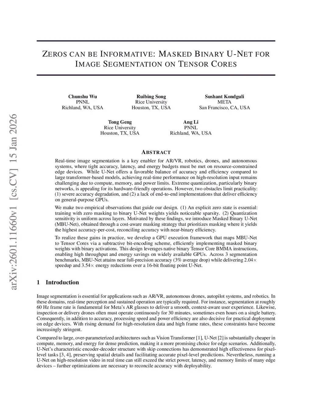 Real-time image segmentation is a key enabler for AR/VR, robotics, drones, and autonomous systems, where tight accuracy, latency, and energy budgets must be met on resource-constrained edge devices. While U-Net offers a favorable balance of accuracy and efficiency compared to large transformer-based models, achieving real-time performance on high-resolution input remains challenging due to compute, memory, and power limits. Extreme quantization, particularly binary networks, is appealing for its hardware-friendly operations. However, two obstacles limit practicality: (1) severe accuracy degradation, and (2) a lack of end-to-end implementations that deliver efficiency on general-purpose GPUs.We make two empirical observations that guide our design. (1) An explicit zero state is essential: training with zero masking to binary U-Net weights yields noticeable sparsity. (2) Quantization sensitivity is uniform across layers. Motivated by these findings, we introduce Masked Binary U-Net (MBU-Net), obtained through a cost-aware masking strategy that prioritizes masking where it yields the highest accuracy-per-cost, reconciling accuracy with near-binary efficiency.To realize these gains in practice, we develop a GPU execution framework that maps MBU-Net to Tensor Cores via a subtractive bit-encoding scheme, efficiently implementing masked binary weights with binary activations. This design leverages native binary Tensor Core BMMA instructions, enabling high throughput and energy savings on widely available GPUs. Across 3 segmentation benchmarks, MBU-Net attains near full-precision accuracy (3% average drop) while delivering 2.04x speedup and 3.54x energy reductions over a 16-bit floating point U-Net.