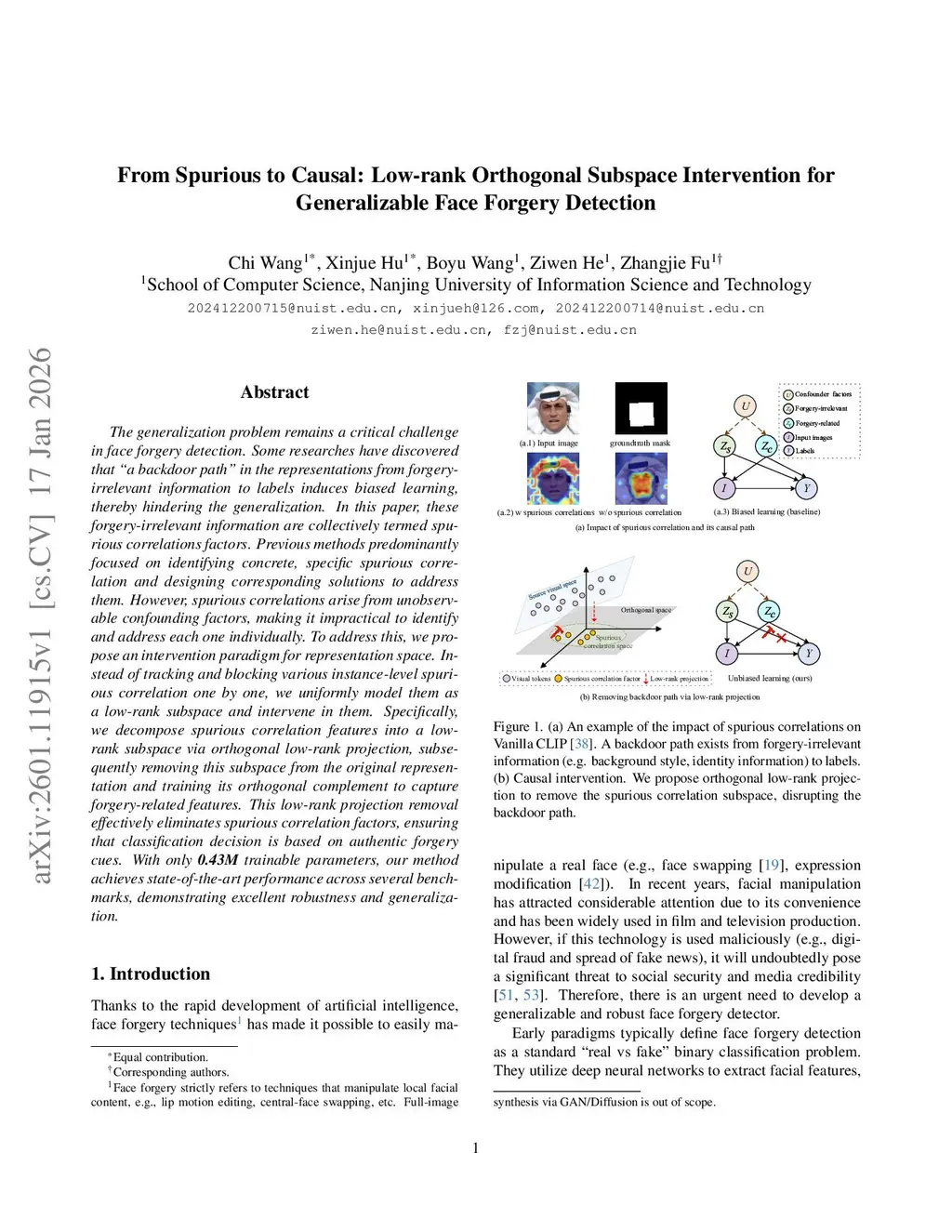 The generalization problem remains a key challenge in face forgery detection. This paper explores the reasons for the generalization failure of Vanilla CLIP: in ``real vs. fake" detection, the few dominant principal components in the feature space primarily encode forgery-irrelevant information, rather than authentic forgery traces. However, this irrelevant information inevitably leads to spurious correlations, severely limiting detector performance. We define this phenomenon as ``low-rank spurious bias". To address this, we propose a low-rank representation space intervention paradigm, named the SeLop, from the perspective of causal representation learning. SeLop unifies the spurious correlation factors irrelevant to forgery into a low-rank subspace and cuts off the statistical shortcut between it and the label, thus aligning representation learning with authentic forgery traces. Specifically, we decompose spurious correlation features into a low-rank subspace through orthogonal low-rank projection, then remove this subspace from the original representation and train its orthogonal complement to capture forgery-related features. This low-rank projection removal effectively eliminates spurious correlation factors, ensuring that classification decisions are based on authentic forgery cues. With only 0.39M trainable parameters, our method achieves state-of-the-art performance across several benchmarks, demonstrating excellent robustness and generalization.