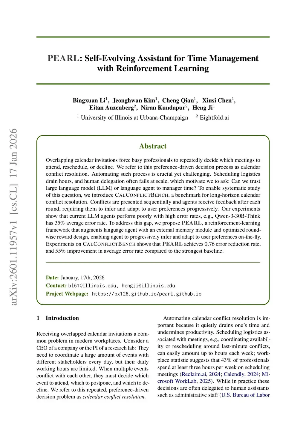 PEARL: Self-Evolving Assistant for Time Management with Reinforcement Learning