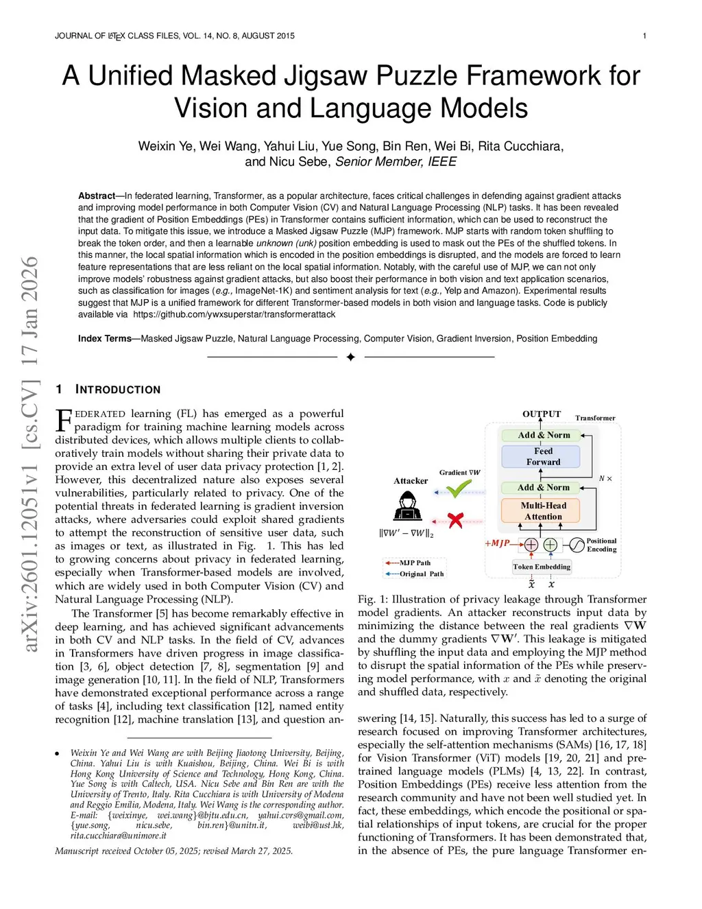 In federated learning, Transformer, as a popular architecture, faces critical challenges in defending against gradient attacks and improving model performance in both Computer Vision (CV) and Natural Language Processing (NLP) tasks. It has been revealed that the gradient of Position Embeddings (PEs) in Transformer contains sufficient information, which can be used to reconstruct the input data. To mitigate this issue, we introduce a Masked Jigsaw Puzzle (MJP) framework. MJP starts with random token shuffling to break the token order, and then a learnable \textit{unknown (unk)} position embedding is used to mask out the PEs of the shuffled tokens. In this manner, the local spatial information which is encoded in the position embeddings is disrupted, and the models are forced to learn feature representations that are less reliant on the local spatial information. Notably, with the careful use of MJP, we can not only improve models' robustness against gradient attacks, but also boost their performance in both vision and text application scenarios, such as classification for images (\textit{e.g.,} ImageNet-1K) and sentiment analysis for text (\textit{e.g.,} Yelp and Amazon). Experimental results suggest that MJP is a unified framework for different Transformer-based models in both vision and language tasks. Code is publicly available viathis https URL
