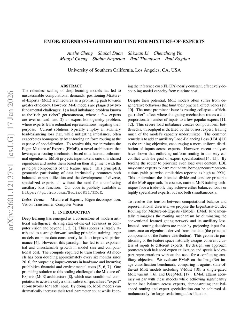 The relentless scaling of deep learning models has led to unsustainable computational demands, positioning Mixture-of-Experts (MoE) architectures as a promising path towards greater efficiency. However, MoE models are plagued by two fundamental challenges: 1) a load imbalance problem known as the``rich get richer" phenomenon, where a few experts are over-utilized, and 2) an expert homogeneity problem, where experts learn redundant representations, negating their purpose. Current solutions typically employ an auxiliary load-balancing loss that, while mitigating imbalance, often exacerbates homogeneity by enforcing uniform routing at the expense of specialization. To resolve this, we introduce the Eigen-Mixture-of-Experts (EMoE), a novel architecture that leverages a routing mechanism based on a learned orthonormal eigenbasis. EMoE projects input tokens onto this shared eigenbasis and routes them based on their alignment with the principal components of the feature space. This principled, geometric partitioning of data intrinsically promotes both balanced expert utilization and the development of diverse, specialized experts, all without the need for a conflicting auxiliary loss function. Our code is publicly available atthis https URL.