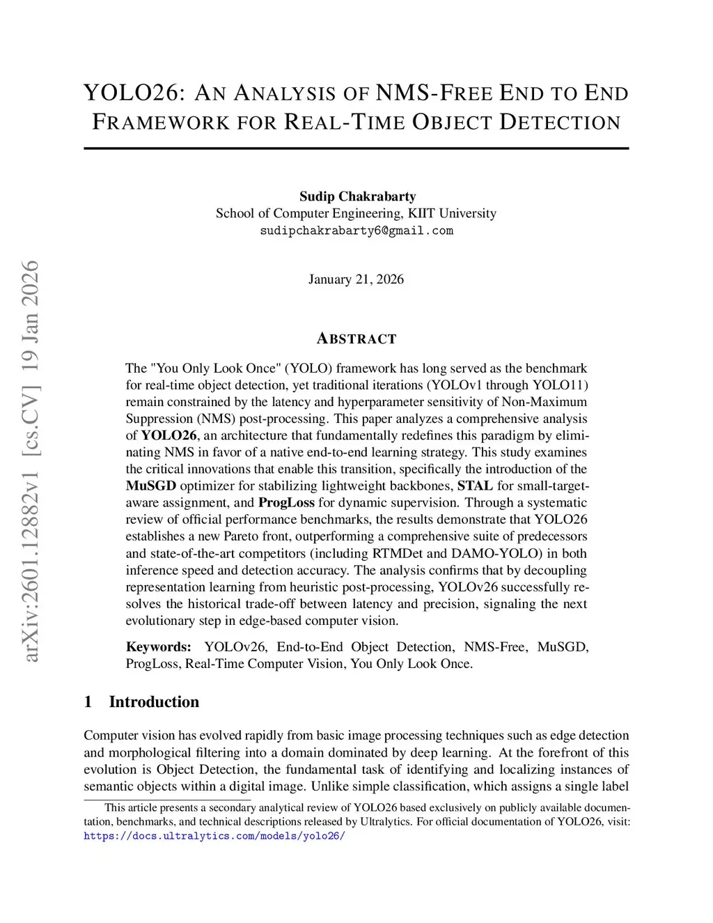 The "You Only Look Once" (YOLO) framework has long served as the benchmark for real-time object detection, yet traditional iterations (YOLOv1 through YOLO11) remain constrained by the latency and hyperparameter sensitivity of Non-Maximum Suppression (NMS) post-processing. This paper analyzes a comprehensive analysis of YOLO26, an architecture that fundamentally redefines this paradigm by eliminating NMS in favor of a native end-to-end learning strategy. This study examines the critical innovations that enable this transition, specifically the introduction of the MuSGD optimizer for stabilizing lightweight backbones, STAL for small-target-aware assignment, and ProgLoss for dynamic supervision. Through a systematic review of official performance benchmarks, the results demonstrate that YOLO26 establishes a new Pareto front, outperforming a comprehensive suite of predecessors and state-of-the-art competitors (including RTMDet and DAMO-YOLO) in both inference speed and detection accuracy. The analysis confirms that by decoupling representation learning from heuristic post-processing, YOLOv26 successfully resolves the historical trade-off between latency and precision, signaling the next evolutionary step in edge-based computer vision.