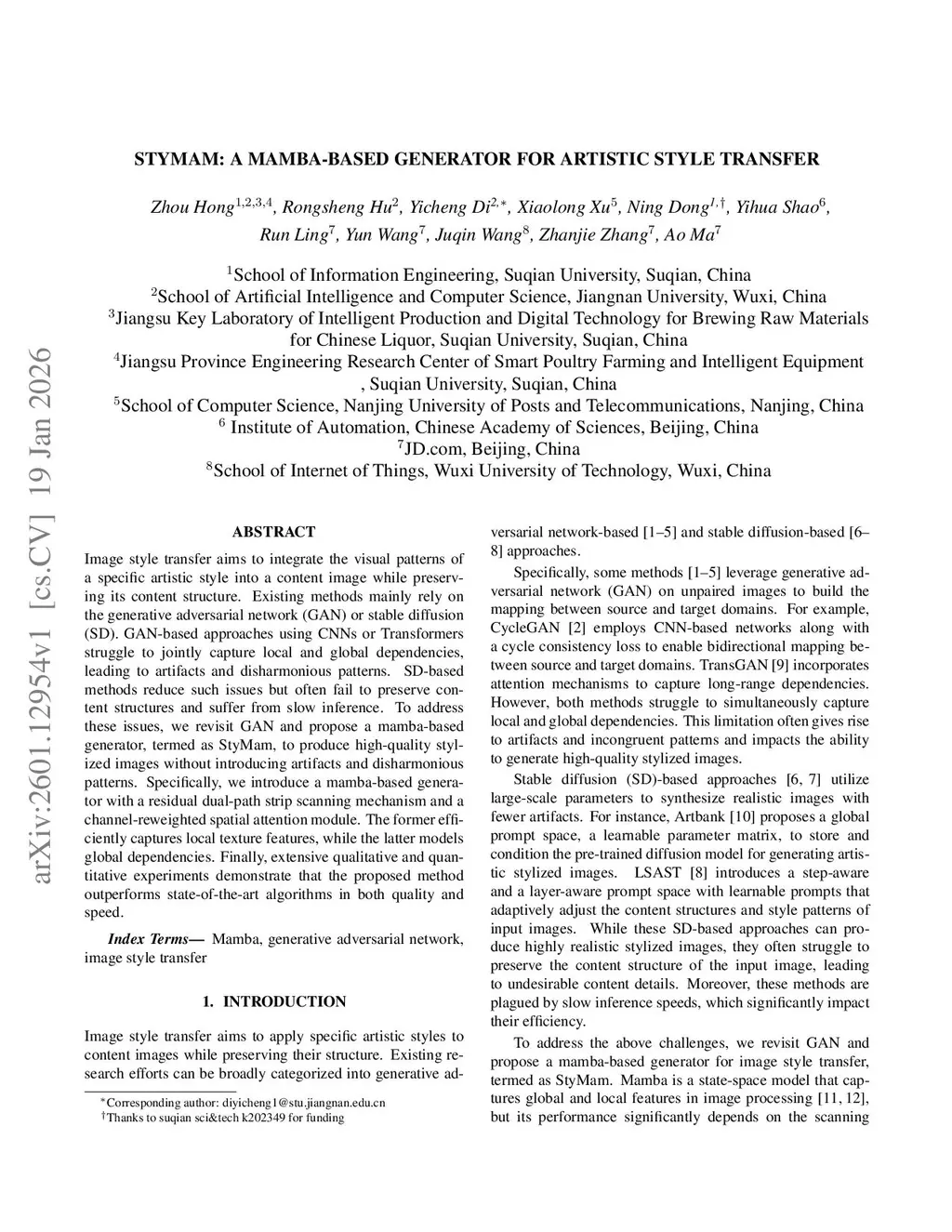 Image style transfer aims to integrate the visual patterns of a specific artistic style into a content image while preserving its content structure. Existing methods mainly rely on the generative adversarial network (GAN) or stable diffusion (SD). GAN-based approaches using CNNs or Transformers struggle to jointly capture local and global dependencies, leading to artifacts and disharmonious patterns. SD-based methods reduce such issues but often fail to preserve content structures and suffer from slow inference. To address these issues, we revisit GAN and propose a mamba-based generator, termed as StyMam, to produce high-quality stylized images without introducing artifacts and disharmonious patterns. Specifically, we introduce a mamba-based generator with a residual dual-path strip scanning mechanism and a channel-reweighted spatial attention module. The former efficiently captures local texture features, while the latter models global dependencies. Finally, extensive qualitative and quantitative experiments demonstrate that the proposed method outperforms state-of-the-art algorithms in both quality and speed.