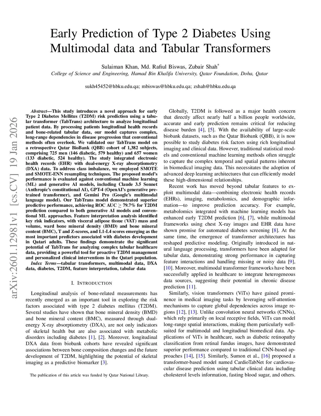 This study introduces a novel approach for early Type 2 Diabetes Mellitus (T2DM) risk prediction using a tabular transformer (TabTrans) architecture to analyze longitudinal patient data. By processing patients` longitudinal health records and bone-related tabular data, our model captures complex, long-range dependencies in disease progression that conventional methods often overlook. We validated our TabTrans model on a retrospective Qatar BioBank (QBB) cohort of 1,382 subjects, comprising 725 men (146 diabetic, 579 healthy) and 657 women (133 diabetic, 524 healthy). The study integrated electronic health records (EHR) with dual-energy X-ray absorptiometry (DXA) data. To address class imbalance, we employed SMOTE and SMOTE-ENN resampling techniques. The proposed model`s performance is evaluated against conventional machine learning (ML) and generative AI models, including Claude 3.5 Sonnet (Anthropic`s constitutional AI), GPT-4 (OpenAI`s generative pre-trained transformer), and Gemini Pro (Google`s multimodal language model). Our TabTrans model demonstrated superior predictive performance, achieving ROC AUC 79.7 % for T2DM prediction compared to both generative AI models and conventional ML approaches. Feature interpretation analysis identified key risk indicators, with visceral adipose tissue (VAT) mass and volume, ward bone mineral density (BMD) and bone mineral content (BMC), T and Z-scores, and L1-L4 scores emerging as the most important predictors associated with diabetes development in Qatari adults. These findings demonstrate the significant potential of TabTrans for analyzing complex tabular healthcare data, providing a powerful tool for proactive T2DM management and personalized clinical interventions in the Qatari population.Index Terms: tabular transformers, multimodal data, DXA data, diabetes, T2DM, feature interpretation, tabular data