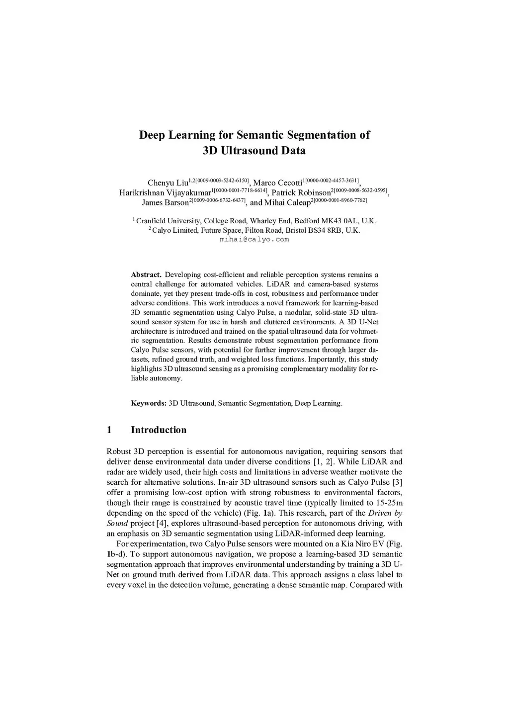 Developing cost-efficient and reliable perception systems remains a central challenge for automated vehicles. LiDAR and camera-based systems dominate, yet they present trade-offs in cost, robustness and performance under adverse conditions. This work introduces a novel framework for learning-based 3D semantic segmentation using Calyo Pulse, a modular, solid-state 3D ultrasound sensor system for use in harsh and cluttered environments. A 3D U-Net architecture is introduced and trained on the spatial ultrasound data for volumetric segmentation. Results demonstrate robust segmentation performance from Calyo Pulse sensors, with potential for further improvement through larger datasets, refined ground truth, and weighted loss functions. Importantly, this study highlights 3D ultrasound sensing as a promising complementary modality for reliable autonomy.